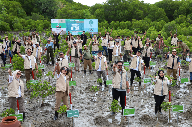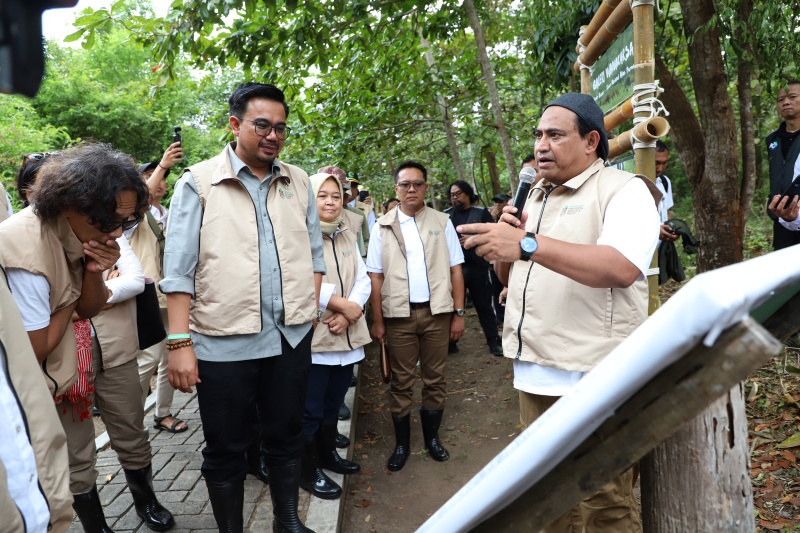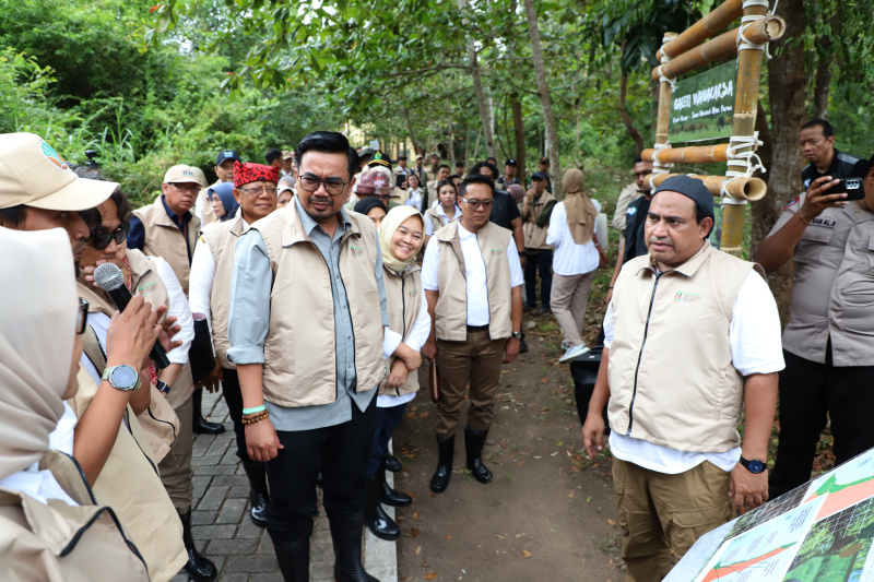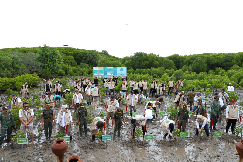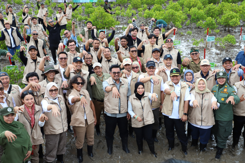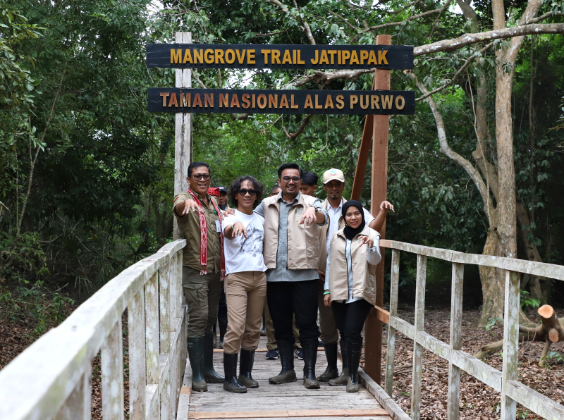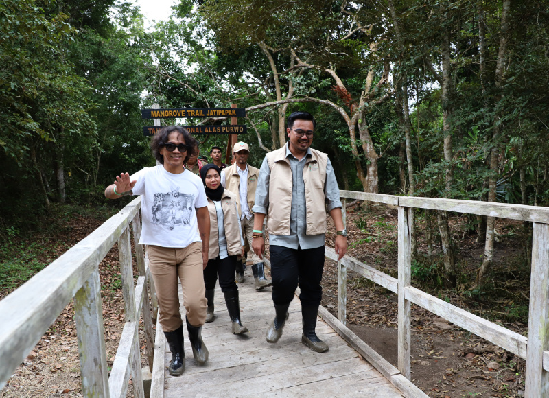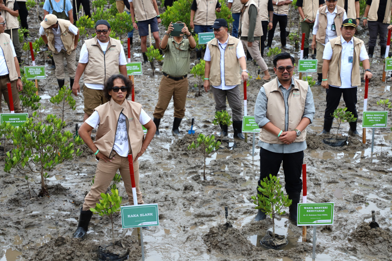 SinPo.id - Wakil Menteri Kehutanan (Wamenhut) Sulaiman Umar Siddiq didampingi istri Arina Sulaiman, Kaka Slank, Melky Bajaj dan bersama jajaran Kementrian Kehutanan, melakukan penanaman Manggrove, di Jatipapak, Taman Nasional Alas Purwo, Banyuwangi, Jawa Timur, Rabu (30 Juli 2025). Penanaman Mangrove bekerja sama dengan Mangroves for Coastal Resilience (M4CR) di Taman Jatipapak Alas Purwo ini merupakan kick off alias pembukaan dari Rangkaian Mangrove Festival (Mangrofest) 2025, yang bertema “Rayakan Mangrove Rangka Harapan”, dengan harapan menjadi momentum konsolidasi nasional berbagai pihak dalam mendorong rehabilitasi mangrove secara berkelanjutan serta menguatkan transisi menuju gaya hidup rendah emisi.