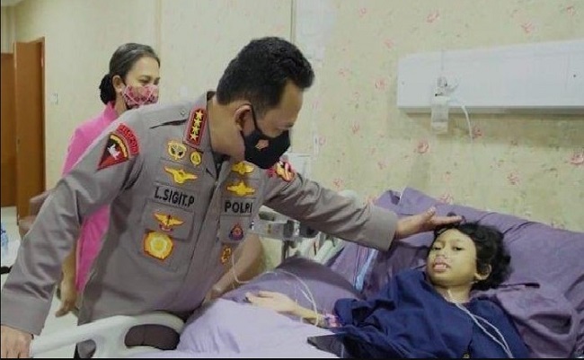 Kapolri Jenderal Listyo Sigit Prabowo menunaikan janjinya terhadap Sinta. Ia berjanji membantu pengobatan Sinta dan menjenguk bocah tersebut.