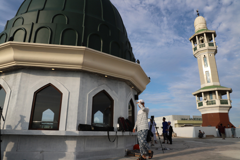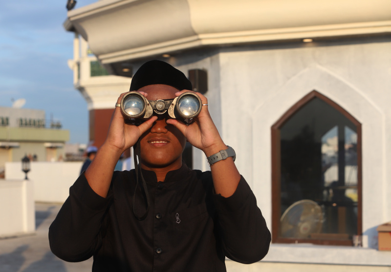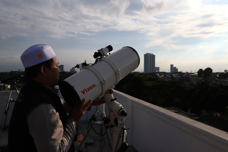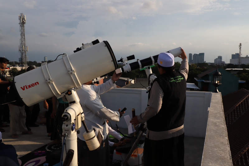 Petugas masjid Al Musyariin melakukan pemantaun hilal untuk menetapkan awal ramadhan (Ashar/SinPo.id)
