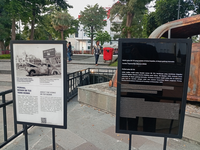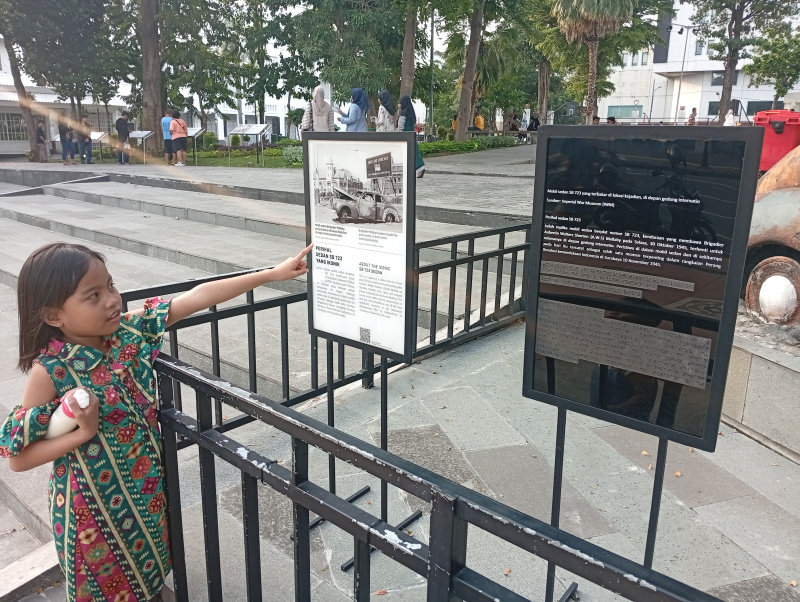 SinPo.id - Sejumlah warga sedang menikmati liburan lebaran Hari Raya Idul Fitri di tempat wisata di Kota Tua Surabaya, Jawa Timur, Minggu (6 April 2025). Terlihat ada bangunan khas sejarah Jembatan Merah dan Mobil Jenderal Inggris AWS Mallaby yang kalah di pertempuran di 10 November melawan para arek-arek Surabaya. Selain itu ada juga hiburan yang disajikan yakni bisa menggendarai naik Jeep keliling kawasan Kota tua Surabaya dan ada tempat bermain khusus anak-anak.