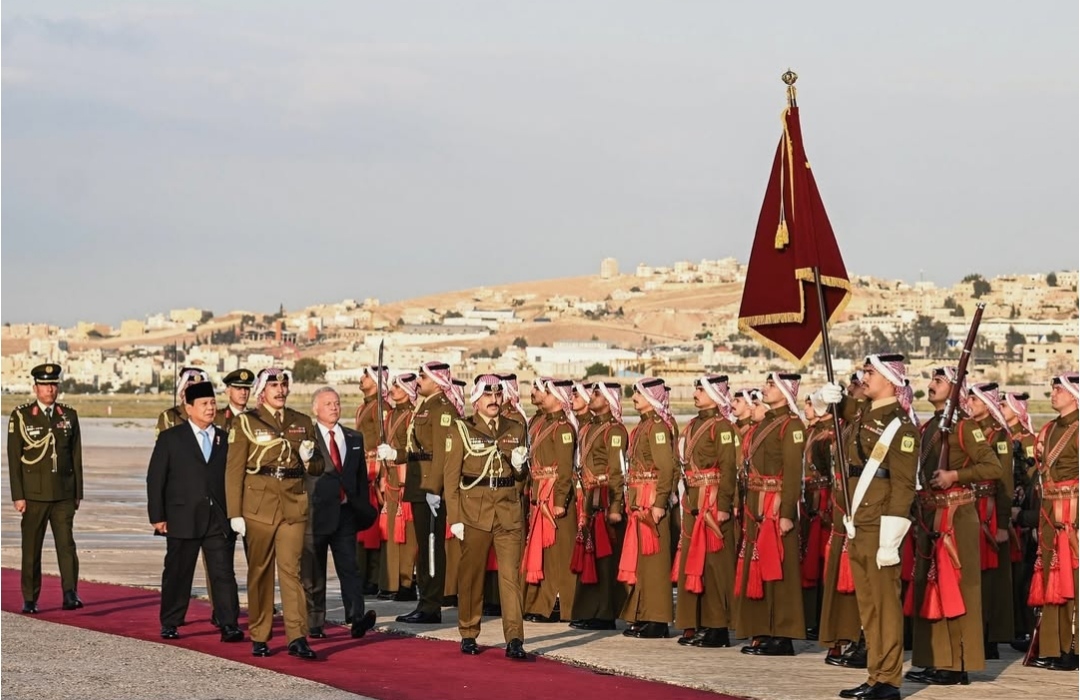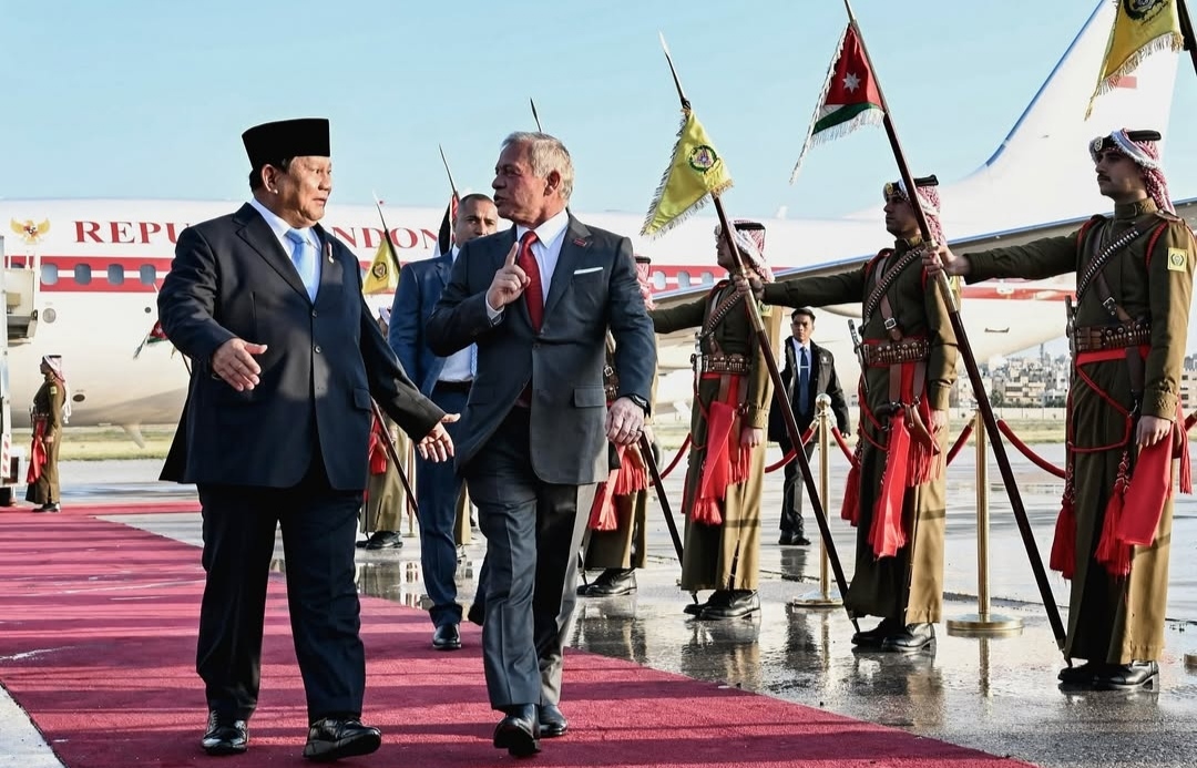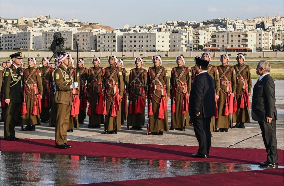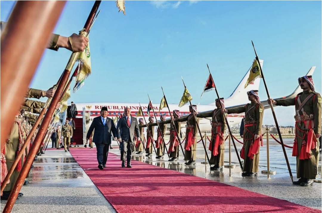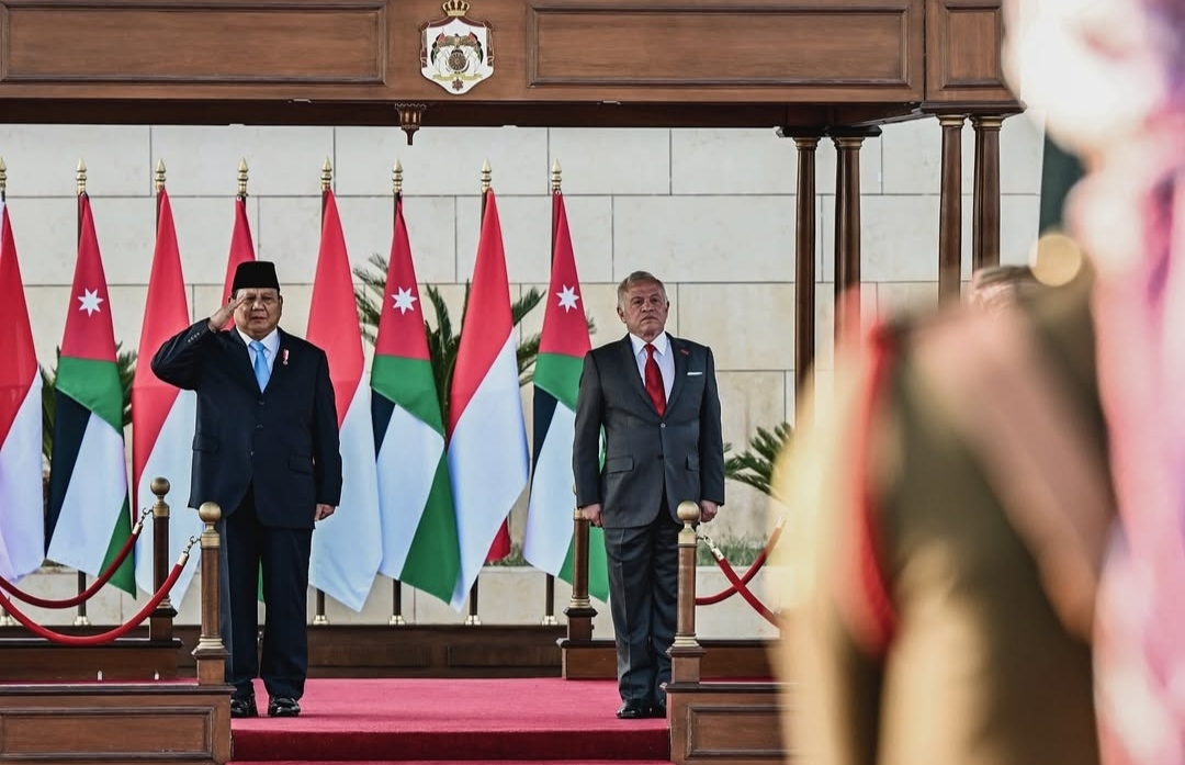 SinPo.id - Presiden Prabowo Subianto dalam lawatan terakhir kenegaraan disambut hangat oleh Raja Yordania Abdullah II bin Al Husein dengan upacara penyambutan yang diiringi oleh pasukan jajar kehormatan di Bandara Udara Militer Marka, Amman, Kerajaan Hasyim Iyah Yordania, Minggu (13 April 2025). Dalam kunjungan tersebut merupakan bagian diplomasi Aktif Presiden di kawasan Timur Tengah untuk memperkuat hubungan strategis Indonesia dengan negara-negara mitra, serta membuka peluang kerja sama yang saling menguntungkan bagi Indonesia dan Yordania.