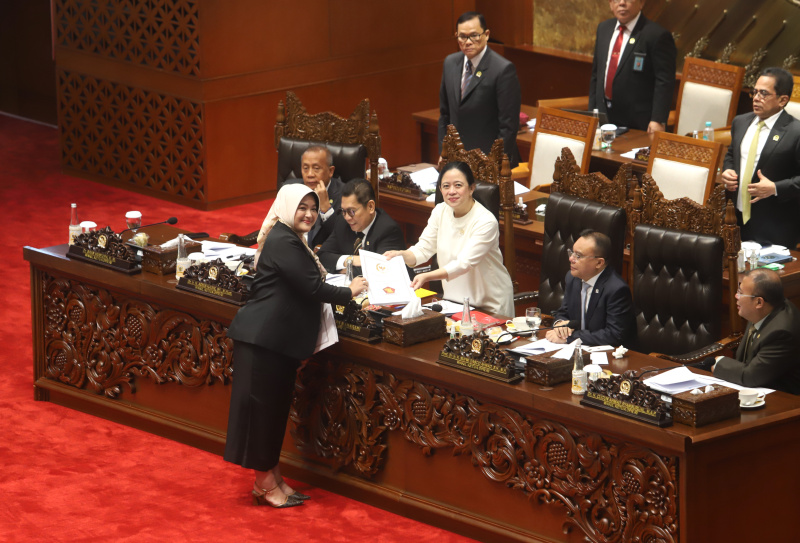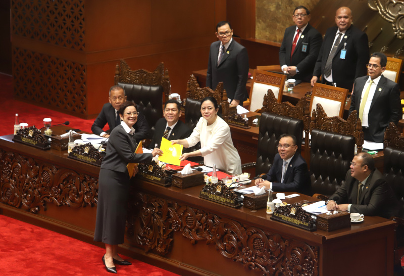 SinPo.id - Juru Bicara Fraksi Partai Gerindra Annisa Mahesa, juru bicara Fraksi Partai Golkar Nurul Arifin memberikan berkas Pandangan Fraksi-fraksi Atas Penyampaian Pemerintah Terhadap Kerangka Ekonomi Makro dan Pokok-pokok Kebijakan Fiskal (KEM dan PPKF) Tahun Anggaran 2026 pada Rapat Paripurna Ke-19 DPR RI Masa Persidangan III Tahun Sidang 2024/2025 di Kompleks Parlemen, Senayan, Jakarta, Selasa (27 Mei 2025). Fraksi Gerindra dan Golkar menyatakan dapat menyetujui untuk melakukan pembahasan lebih lanjut dengan pemerintah terhadap KEM-PPKF 2026 dan agar pandangan di atas dapat memyempurnakan KEM-PPKF 2026 bersama Menteri Keuangan Sri Mulyani.