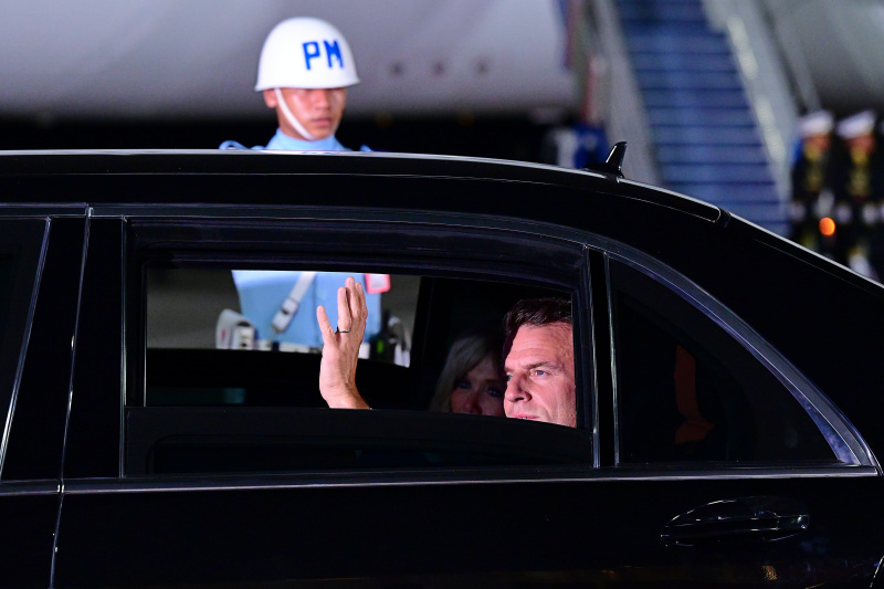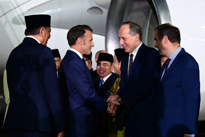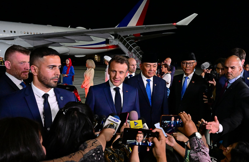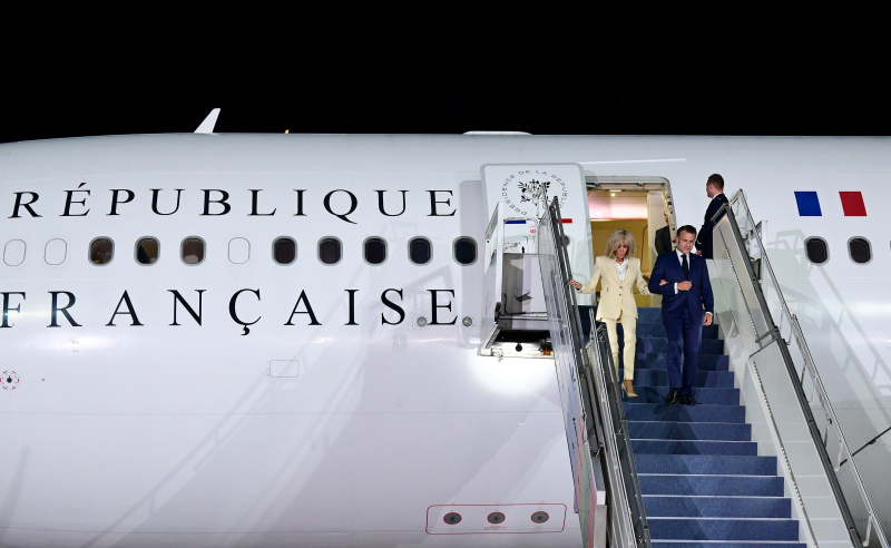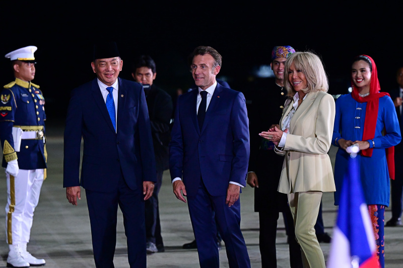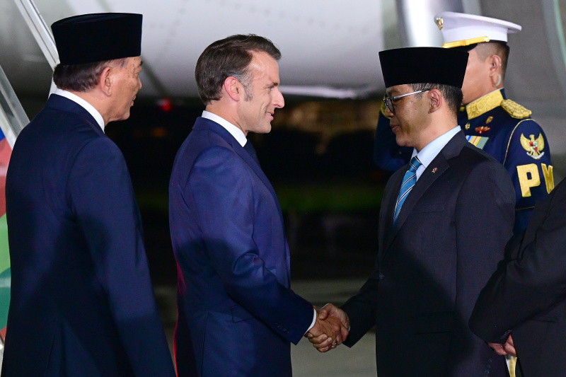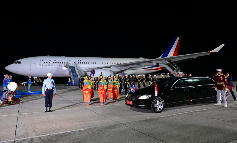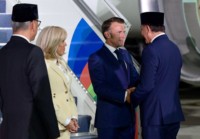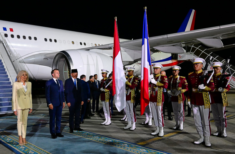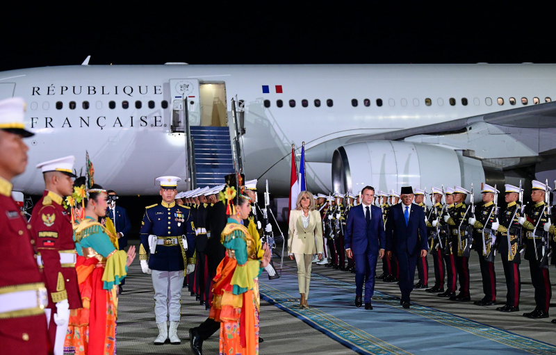 SinPo.id - Presiden Prancis Emmanuel Macron (tengah) didampingi Brigitte Macron (kiri) disambut Menteri Pertahanan Sjafrie Sjamsoeddin, saat tiba untuk melakukan kunjungan kenegaraan di Pangkalan Udara TNI AU Halim Perdanakusuma, Jakarta, (27 Mei 2025). Presiden Prancis Emmanuel Macron akan melakukan pertemuan dengan Presiden Prabowo Subianto, membahas berbagai kerjasama memperkuat hubungan bilateral kedua negara, serta menandatangani Letter of Intent dikhususkan untuk memperkuat bidang pertahanan diantaranya alutsista strategi, pesawat tempur dan kapal selam.