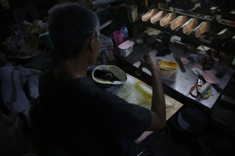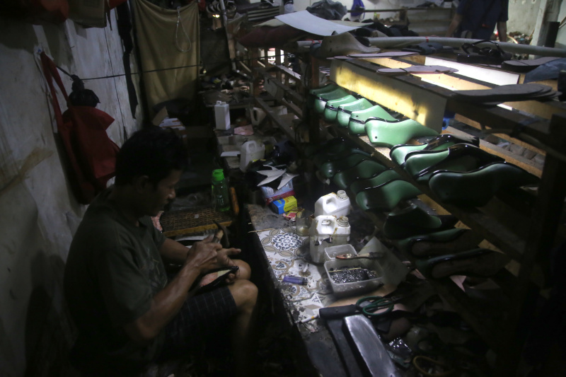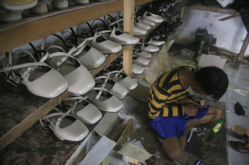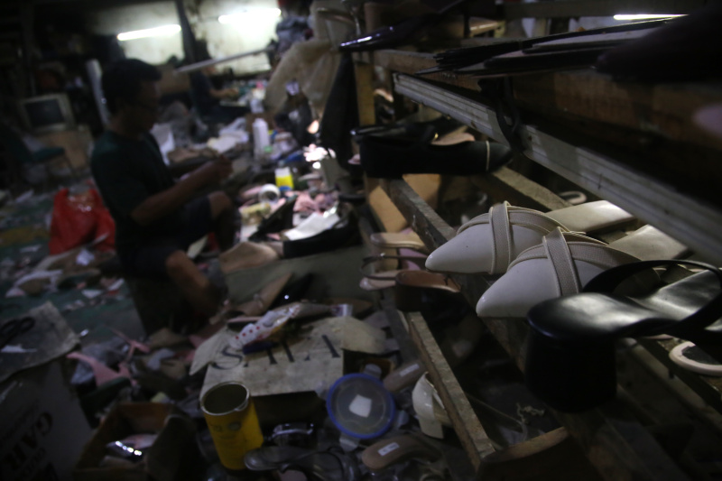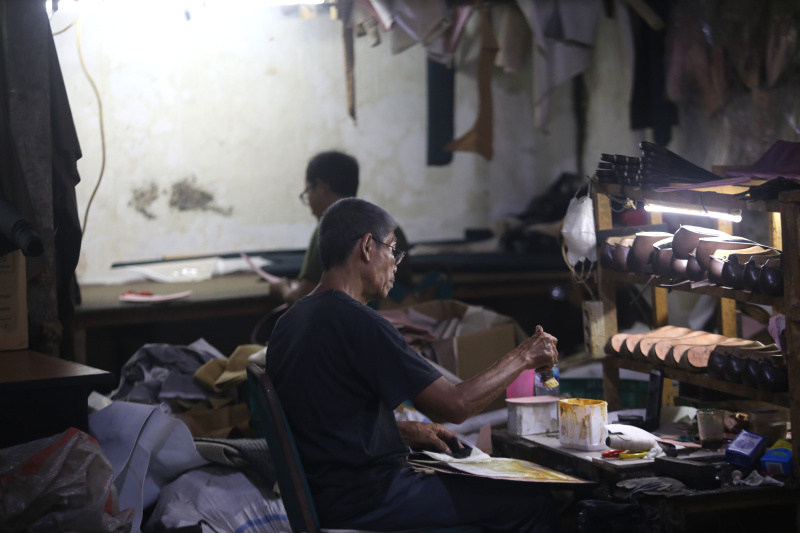Pekerja sedang menyelesaikan pembuatan sepatu di kawasan Serua, Depok (Ashar/SinPo.id)