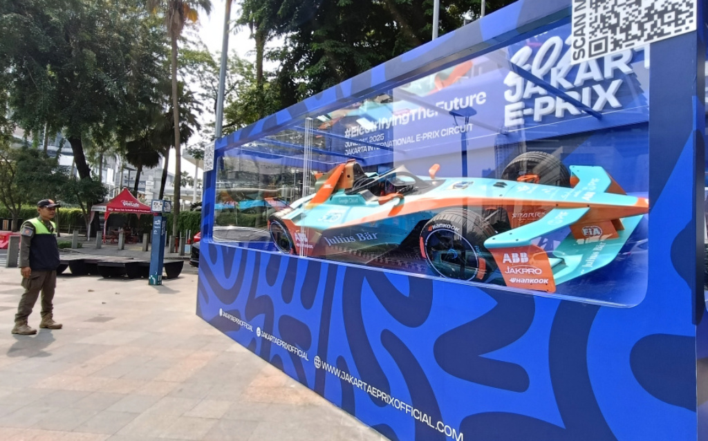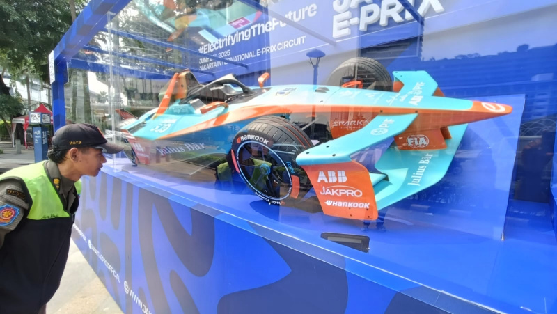 SinPo.id - Warga melihat pajangan replika mobil balap listrik Formula E Gen3 Evo yang dipamerkan di kawasan Bundaran HI, Jakarta, Kamis (5 Juni 2025). Pajangan replika mobil balap listrik Formula E Gen 3 Evo tersebut sebagai bentuk promosi menjelang diadakannya ajang balap Formula E Jakarta E-Prix 2025 musim ke-11 di Jakarta International E-Prix Circuit (JIEC), Jakarta Utara pada 21 Juni 2025 mendatang.