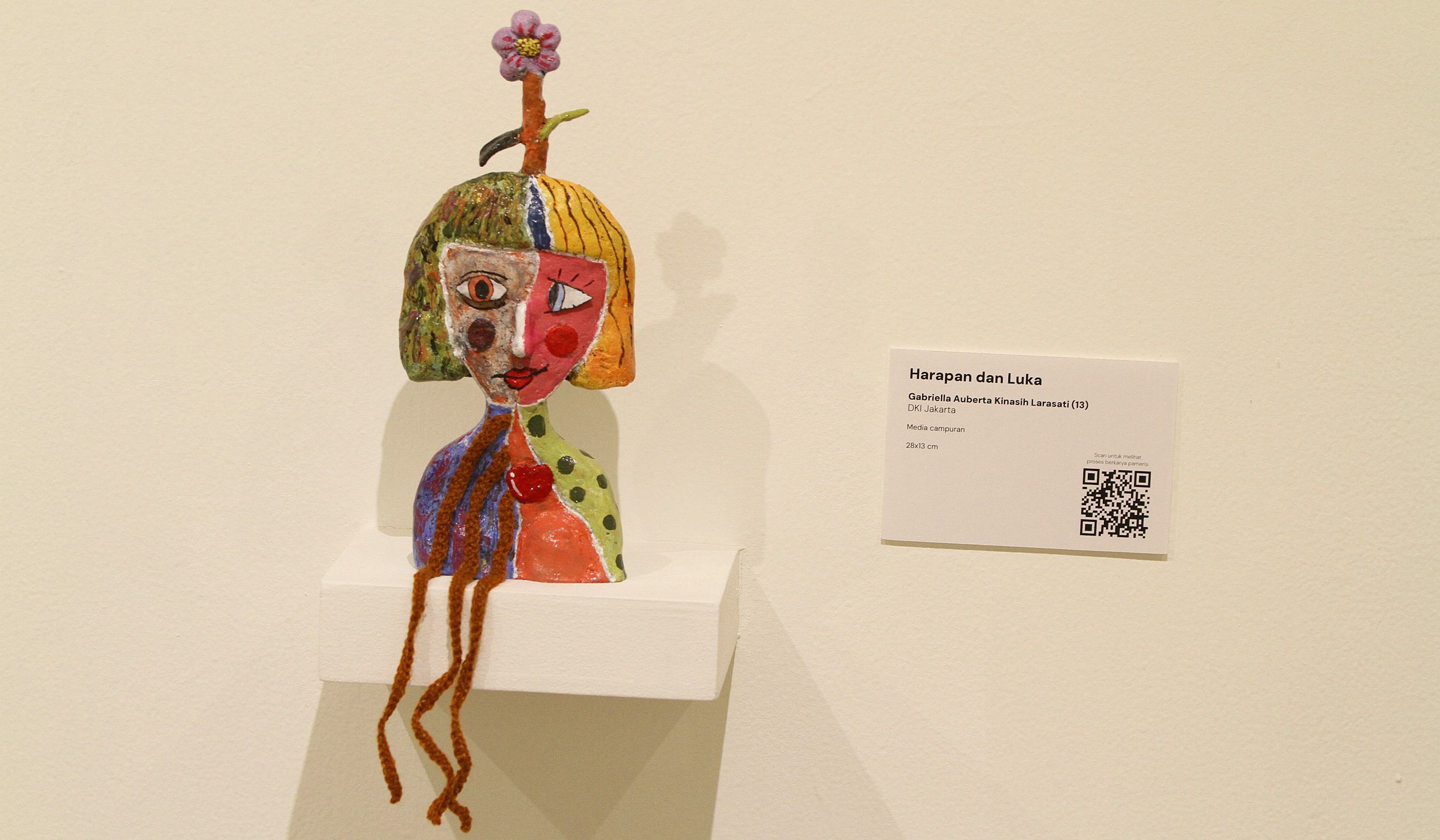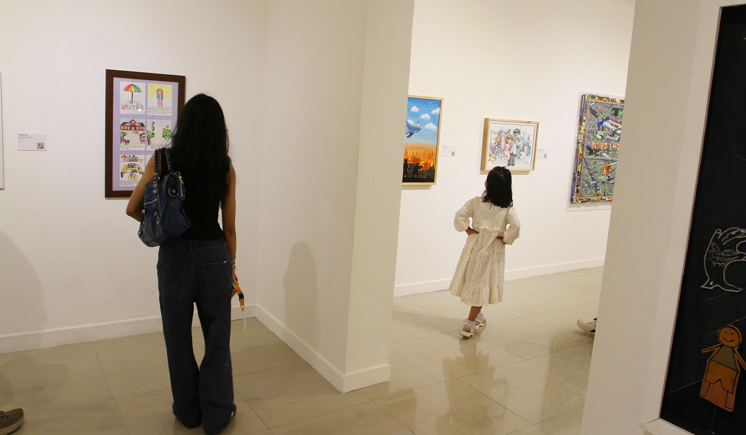 SinPo.id - Pengunjung mencoba karya seni yang dipamerkan pada pameran Kids Biennale Indonesia 2025 di Galeri Nasional Indonesia, Jakarta, Sabtu (5 Juli 2025). Pameran yang menampilkan 142 hasil karya dari anak-anak berumur 6-17 tahun tersebut mengangkat tema Tumbuh Tanpa Takut sebagai medium perlawanan kesetaraan, penyembuhan dan pemberdayaan atas ancaman kekerasan seksual perundungan dan intoleransi yang kerap dialami anak-anak dalam masa pertumbuhan.