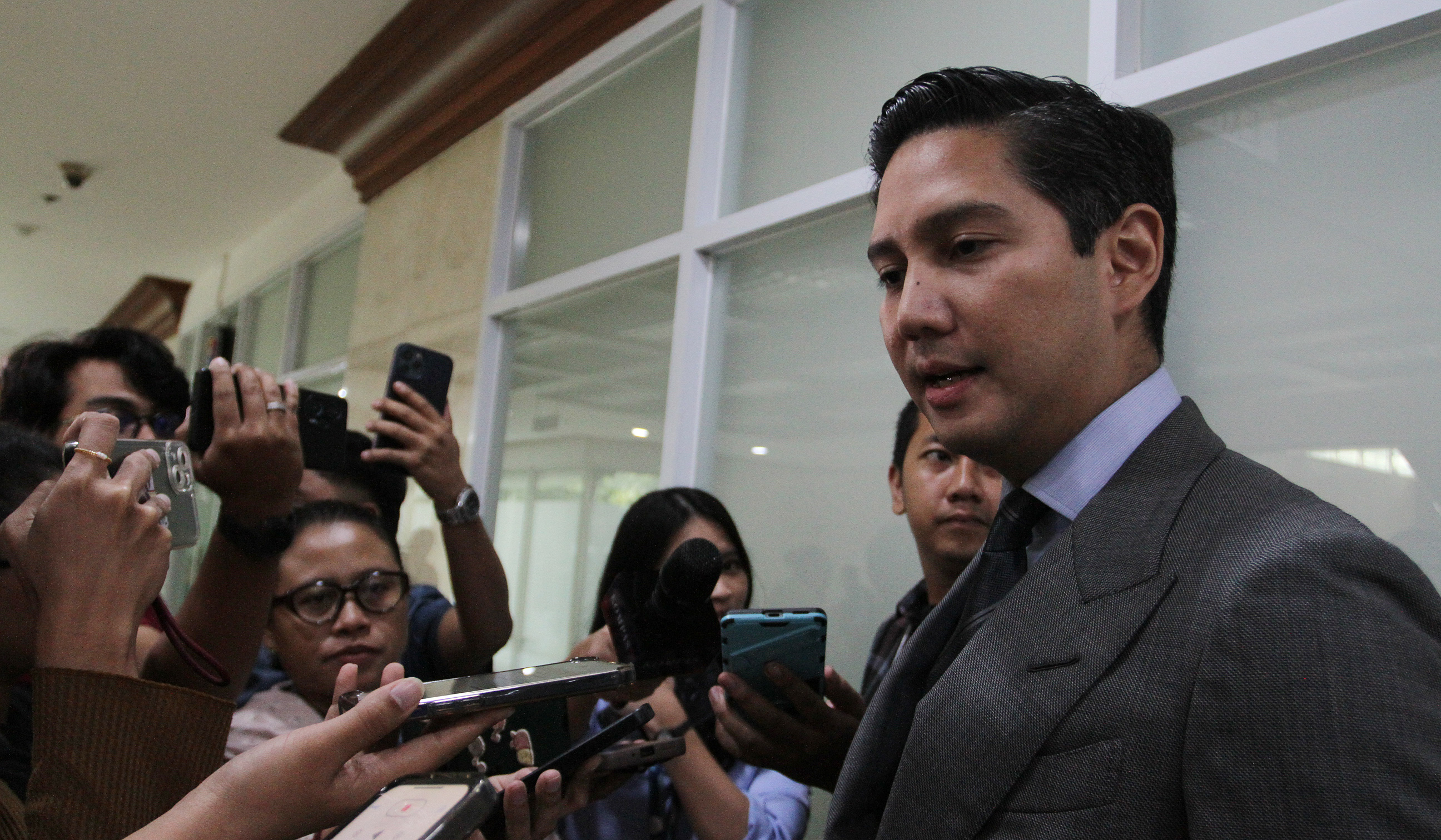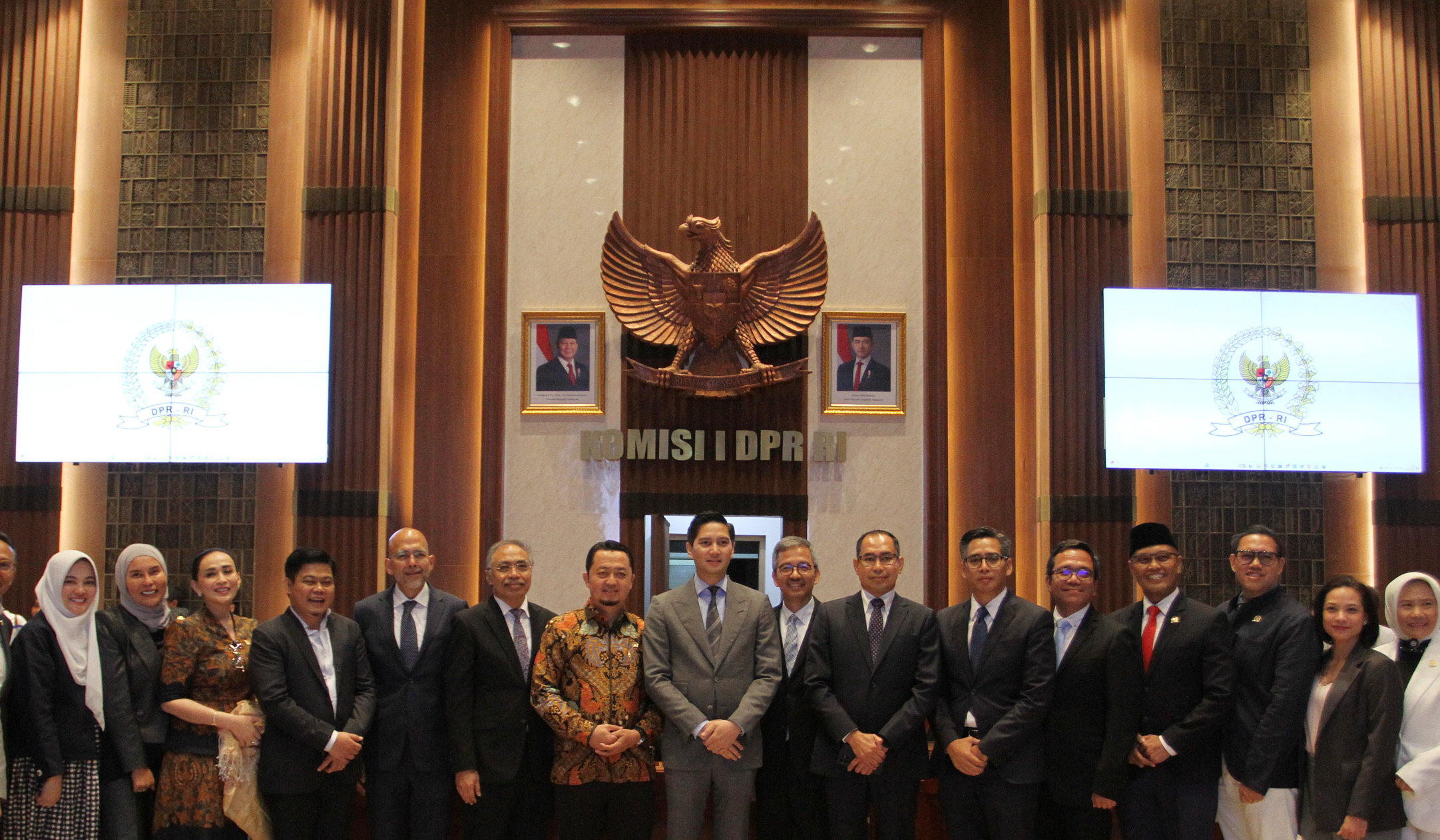 Wakil Ketua Komisi I DPR RI Budisatrio Djiwandono, foto bersama calon duta besar (dubes) Indonesia usai menggelar fit and proper test di ruang rapat Komisi I DPR RI, kompleks parlemen, Senayan, Jakarta, Sabtu (5 Juli 2025).