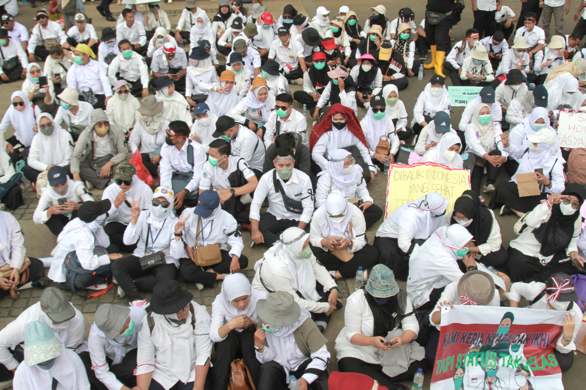 SinPo.id - Ratusan Tenaga Kesehatan (Nakes) menggelar aksi demonstrasi di Patung Arjuna Wiwaha atau Patung Kuda, di Jalan Merdeka Barat, Jakarta Pusat, Kamis (22 September 2022). Dalam aksi demo ratusan nakes yang tergabung dalam Dewan Pengurus Nasional Forum Komunikasi Nakes dan Non-Nakes Indonesia (DPN FHKN Indonesia) menuntut agar nakes honorer segera diangkat menjadi ASN.
