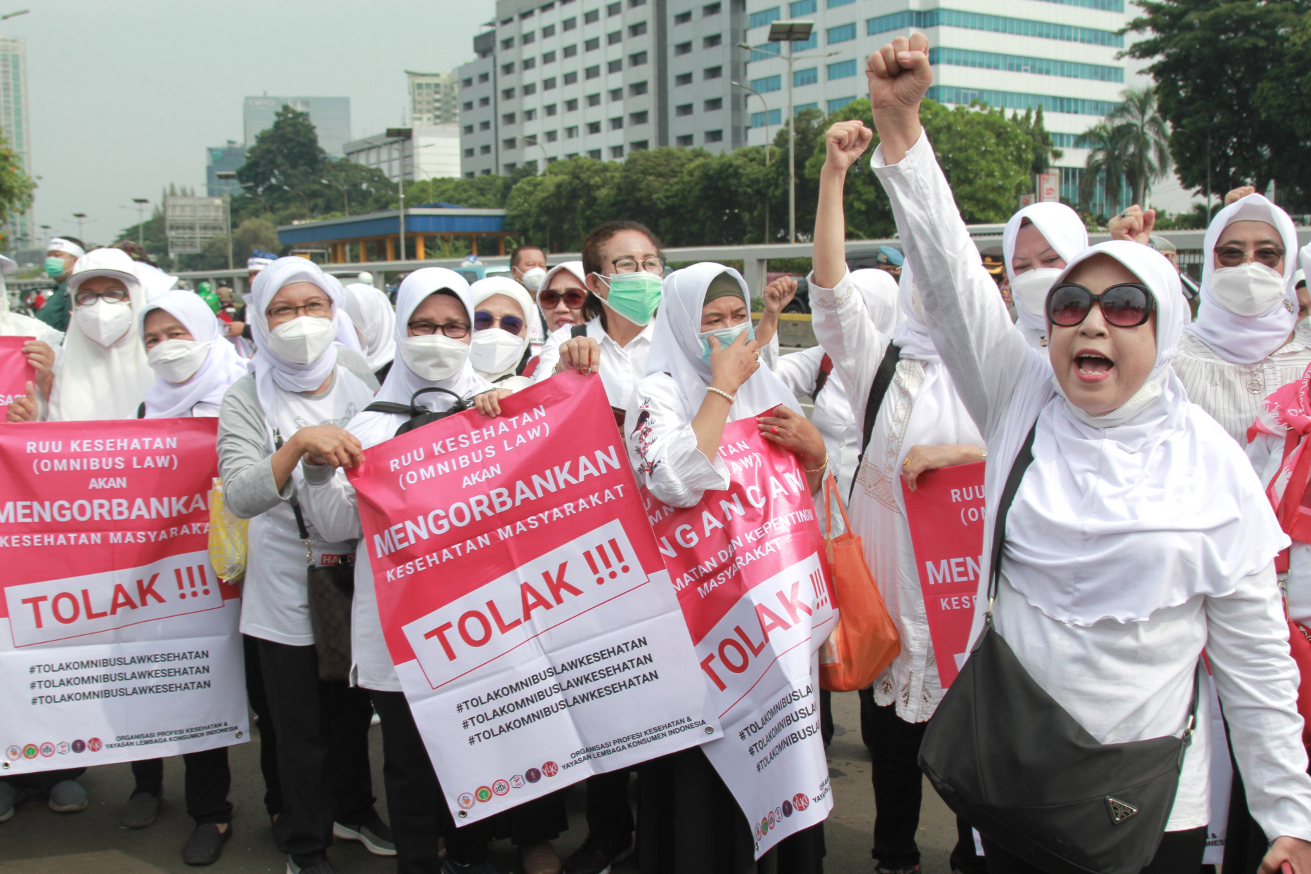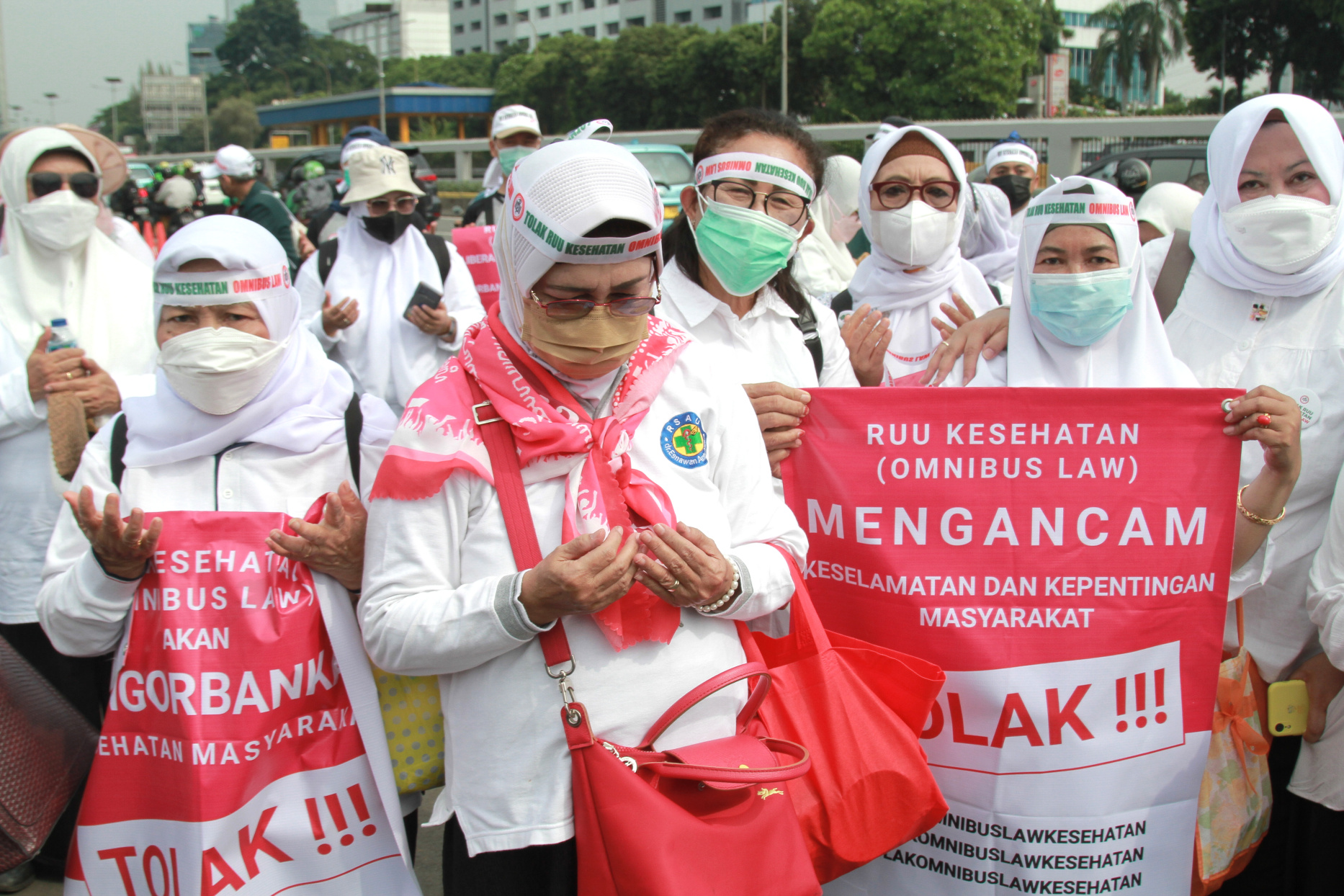 SinPo.id - Organisasi dari IDI (Ikatan Dokter Indonesia), Persatuan Dokter Gigi Indonesia (PDGI), Persatuan Perawat Nasional Indonesia (PPNI), Ikatan Bidan Indonesia (IBI), Ikatan Apoteker Indonesia (IAI), dan Yayasan Lembaga Kesehatan Indonesia (YLKI) menggelar aksi demo di depan Gedung DPR RI, Jakarta, Senin (28 November 2022). Dari aksi demo tersebut menolak RUU Kesehatan Omnibus Law, ada tiga tuntutan yang disampaikan yakni, Menolak RUU Kesehatan (Omnibusla Law) dan mendesak pimpinan DPR RI agar RUU ini dikeluarkan dari Prolegnas Prioritas, Menolak Liberalisasi dan Kapitalisasi Kesehatan, Menolak Pelemahan Profesi Kesehatan dan Penghilangan Peran-Peran Organisasi Profesi.