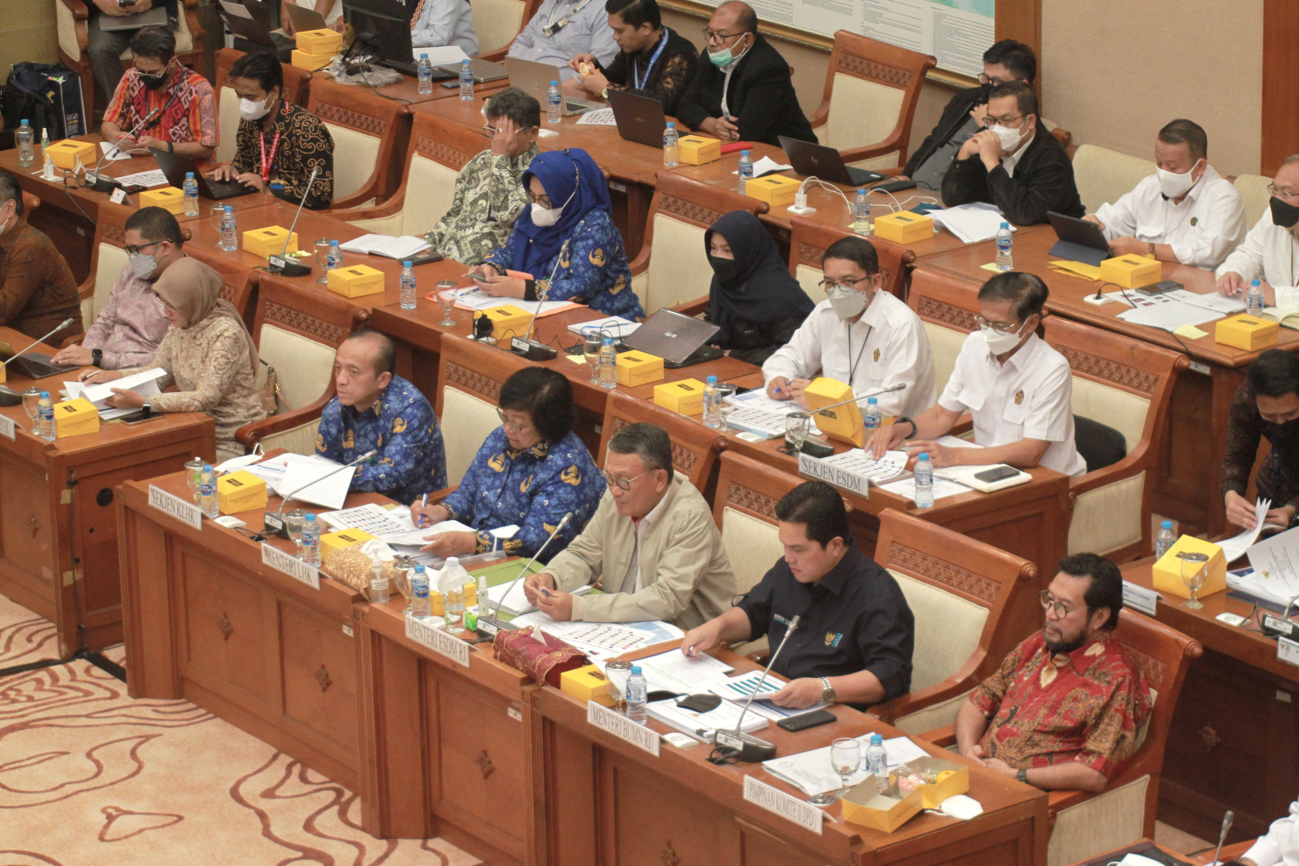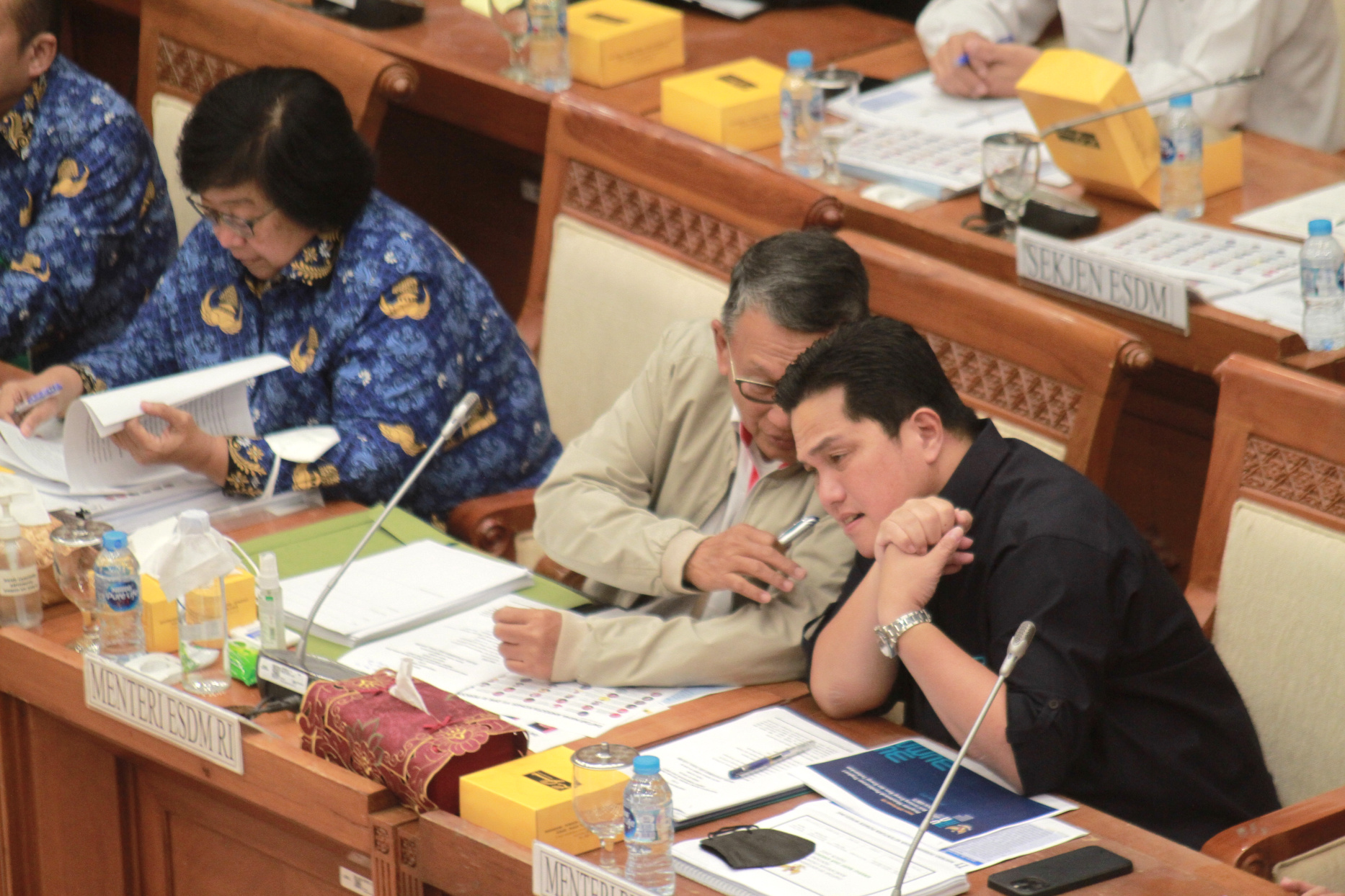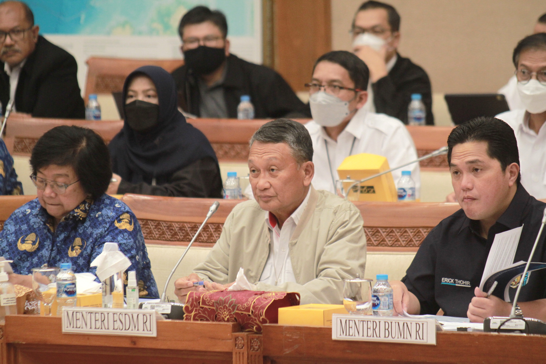 SinPo.id - Komisi VII DPR RI menggelar Rapat Kerja (Raker) bersama Menteri Badan Usaha Milik Negara (BUMN), Erick Tohir, Menteri Energi dan Sumber Data Mineral (ESDM), Arifin Tasrif, Menteri Lingkungan Hidup dan Kehutanan (LHK), Siti Nurbaya, dan Komite II DPD di Kompleks Parlemen, Senayan, Jakarta, Selasa (29 November 2022). Dalam Raker tersebut dipimpin oleh Ketua Komisi VII, Sugeng Suparwoto membahas agenda mengenai penjelasan Musyawarah Rancangan Undang-Undang Energi Baru dan Energi Terbarukan (RUU EB-ET).