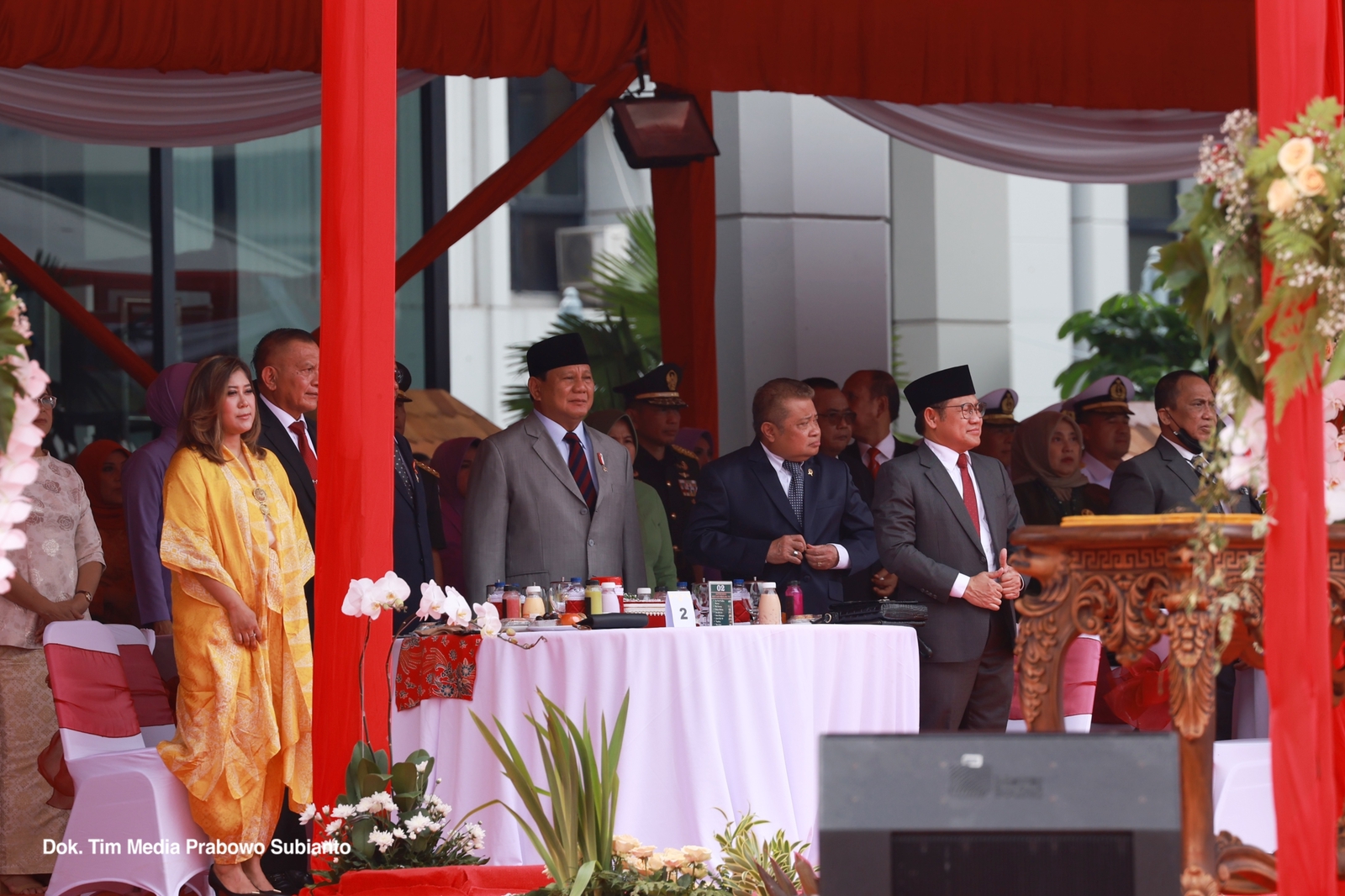 SinPo.id - Menteri Pertahanan (Menhan) Prabowo Subianto atau yang akrab disapa Pak Bowo menghadiri upacara serah terima jabatan (Sertijab) Panglima TNI dari Jenderal TNI Andika Prakasa kepada Laksamana Yudo Margono di Mabes TNI, Cilangkap, Jakarta Timur, Selasa (20 Desember 2022). Agenda sertijab dilakukan tepat sehari setelah Yudo Margono dilantik oleh Presiden Joko Widodo di Istana Negara, Senin (19/12). Dalam pelantikan tersebut, Pak Bowo hadir sebagai saksi penandatanganan berita acara Pengangkatan dan Pelantikan TNI. Pada kesempatan tersebut, Pak Bowo hadir mengenakan jas abu-abu dan kopiah hitam. Ia duduk bersama Menteri Koordinator Bidang Politik, Hukum dan Keamanan (Menko Polhukam) RI, Mahfud MD, Wakil Ketua DPR RI, Muhaimin Iskandar dan Ketua Komisi I DPR RI, Meutya Hafid. Serah terima jabatan itu ditandai dengan penyerahan Panji TNI Tri Dharma Eka Karma dan penandatangan naskah serah terima jabatan.