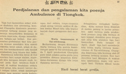 Pada tanggal 10 April, djadi tiga hari sasoedanja kita trima warta tentang kamenangan di Tai-erlchwang, Changsha disatronin tida koerang oleh 27 pesawat terbang moesoe. Itoe hari djoestroe hari Minggoe di waktoe kita sabetoelnja dapet vrij satengah hari. Tatkala dikasi tanda moesoe soeda berlaloe, dengen kita poenja auto ambulance kita lantas brangkat ka tempat dimana moesoe sebarken bom-bom kematian. Dalem bombardement ini ada seratoes orang lebih jang dapet kematian setjara ngeri.