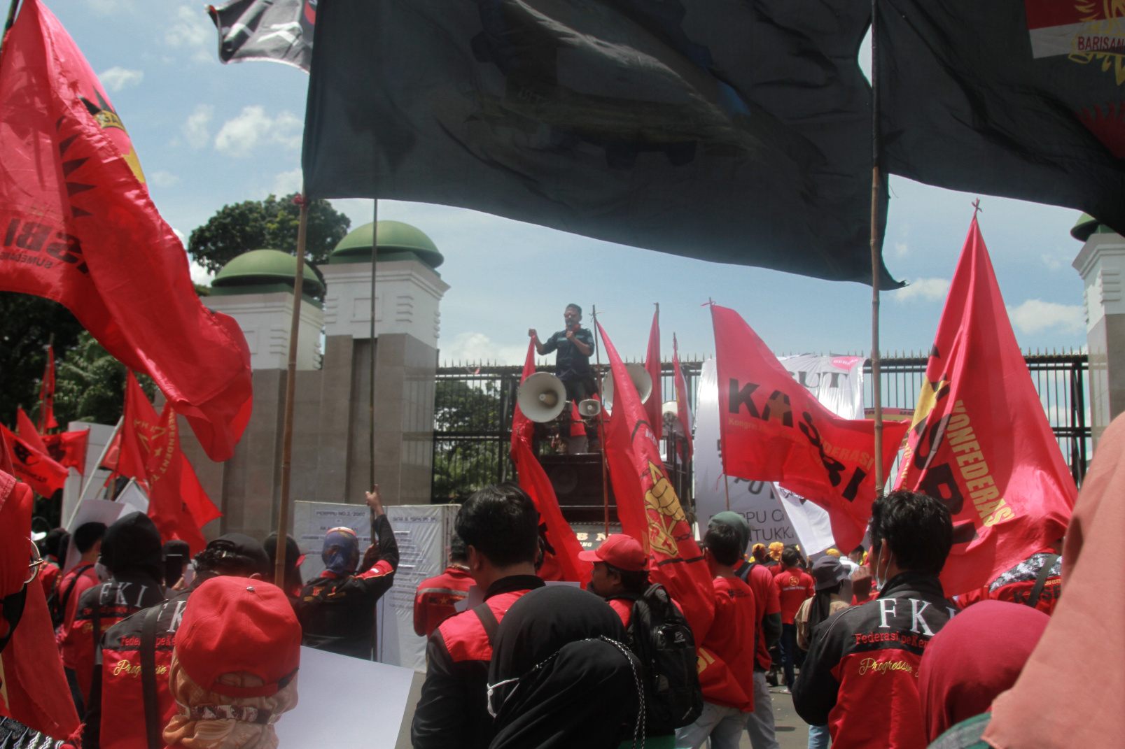 SinPo.id - Ratusan buruh menggelar demo di depan DPR menolak Perppu Cipta Kerja di Kompleks Parlemen, Senayan, Jakarta, Selasa (10 Januari 2023). Dalam demo tersebut para buruh yang tergabung dari KASBI (Kongres Aliansi Serikat Buruh Indonesia) dan KPBI (Konfederasi Persatuan Buruh Indonesia) menuntut pemerintah segera mencabut Perppu Cipta Kerja.
