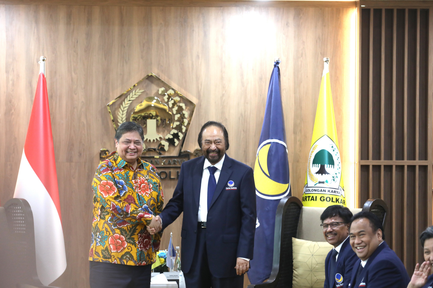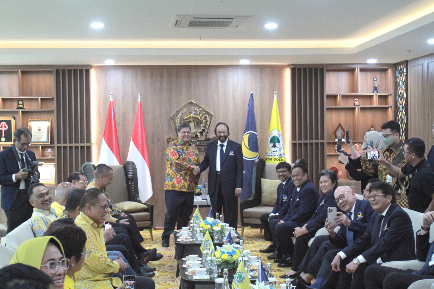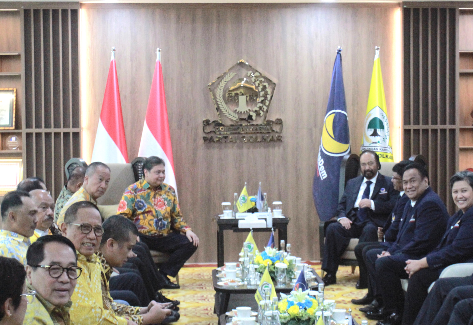 SinPo.id - Ketua Umum Partai NasDem Surya Paloh bertemu Ketua Umum Partai Golkar Airlangga Hartarto saat menyambangi di DPP Partai Golkar Anggrek Nelly Murni, Jakarta, Rabu (1 Febuari 2023). Surya Paloh didampingi Sekjen Partai NasDem sekaligus Menteri Komunikasi dan Informatika (Menkominfo) Johnny G Plate, Wakil Ketua DPR RI Rachmat Gobel beserta jajaran DPP lain. Airlangga mengatakan pertemuan itu sebagai bentuk silaturahmi sekaligus agenda lanjutan dari pertemuan dirinya dengan Surya Paloh di DPP NasDem.