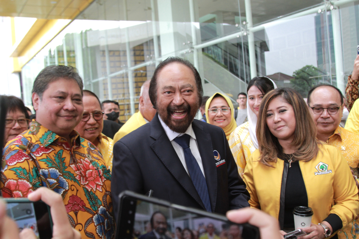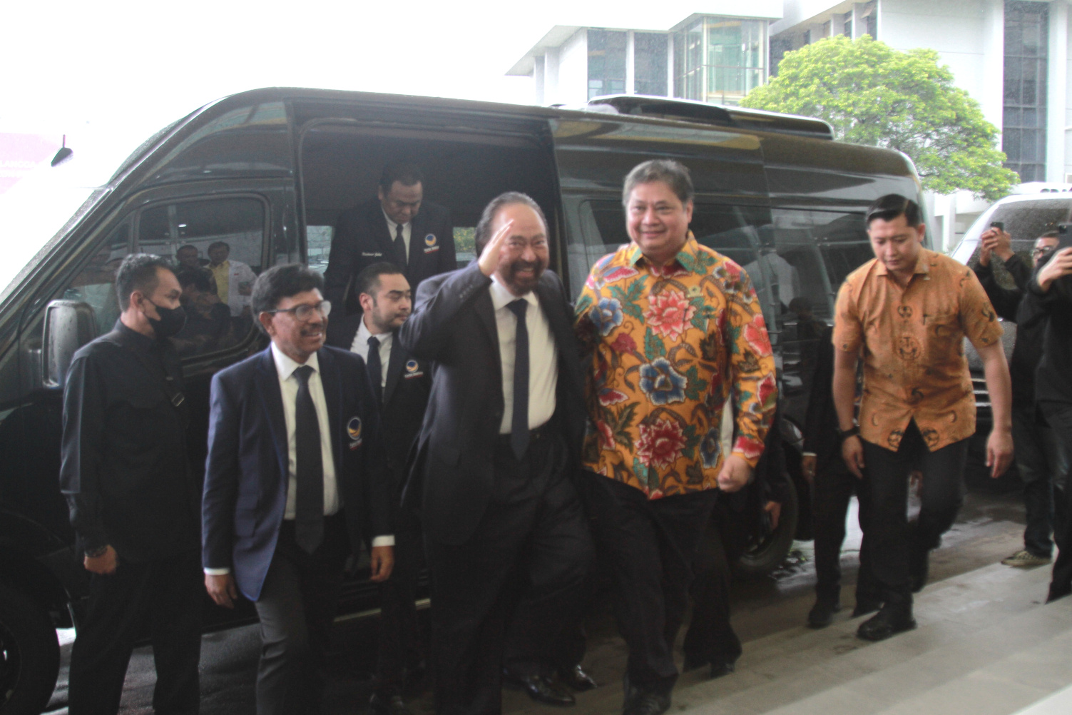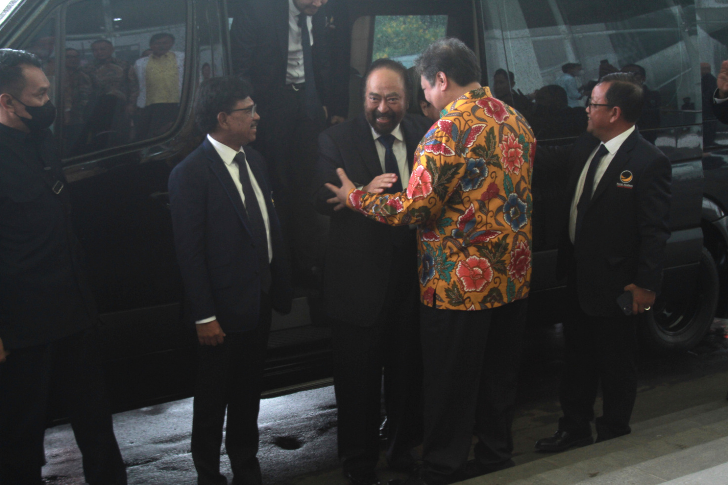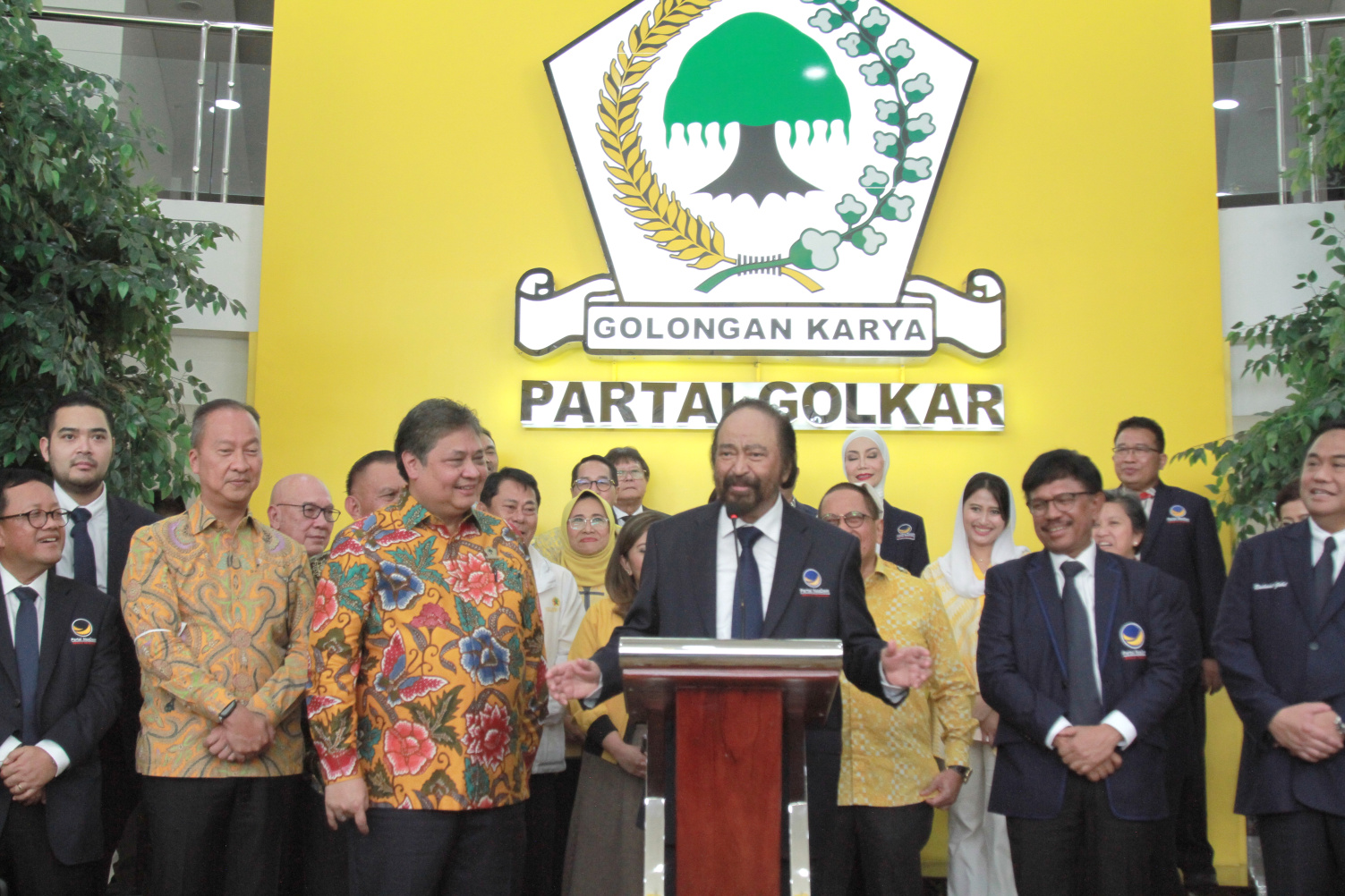 SinPo.id - Ketua Umum Partai NasDem Surya Paloh bertemu Ketua Umum Partai Golkar Airlangga Hartarto saat menyambangi di DPP Partai Golkar Anggrek Nelly Murni, Jakarta, Rabu (1 Febuari 2023). Surya Paloh didampingi Sekjen Partai NasDem sekaligus Menteri Komunikasi dan Informatika (Menkominfo) Johnny G Plate, Wakil Ketua DPR RI Rachmat Gobel beserta jajaran DPP lain. Airlangga mengatakan pertemuan itu sebagai bentuk silaturahmi sekaligus agenda lanjutan dari pertemuan dirinya dengan Surya Paloh di DPP NasDem.