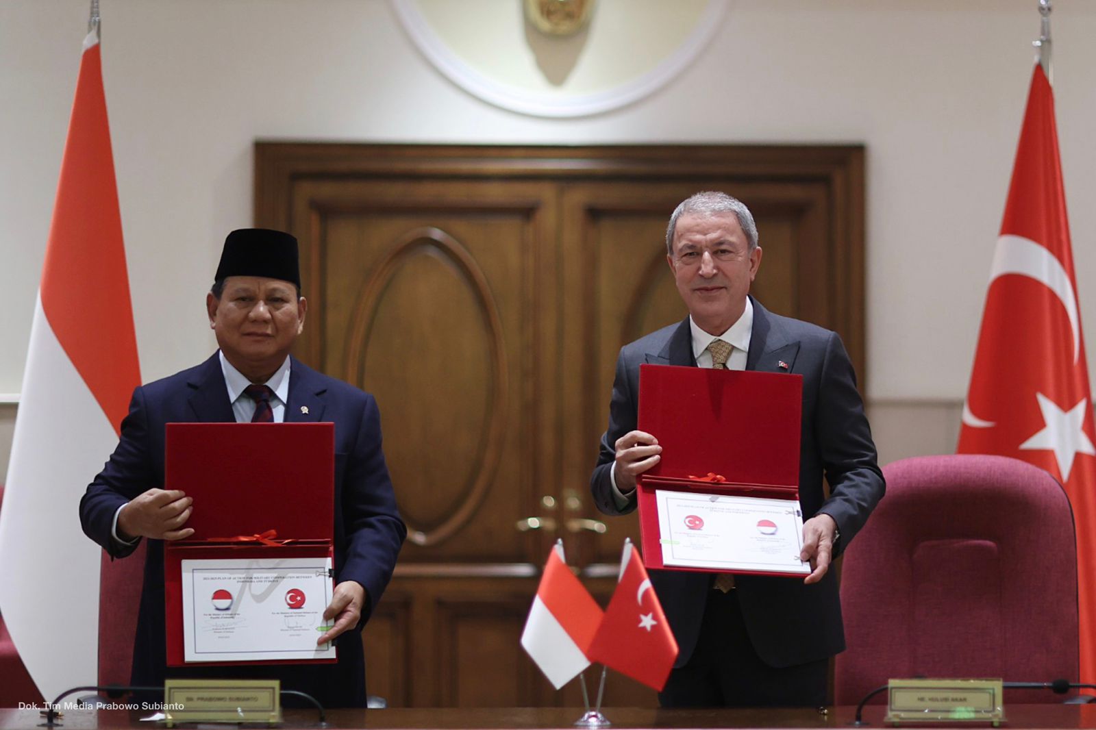 Menhan Prabowo Subianto melaksanakan pertemuan dengan Menteri Pertahanan Turki Hulusi Akar untuk menjalin kerja sama di bidang pertahanan antara Indonesia dan Turki (Foto:Tim Prabowo/SinPo.id)