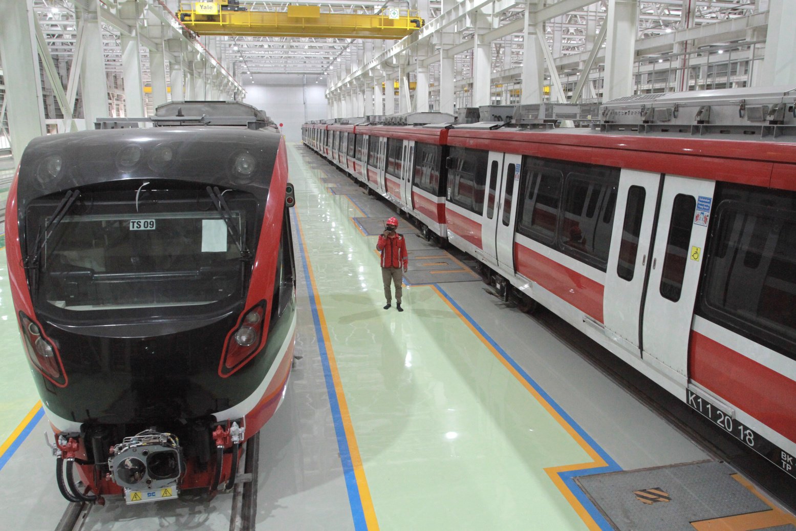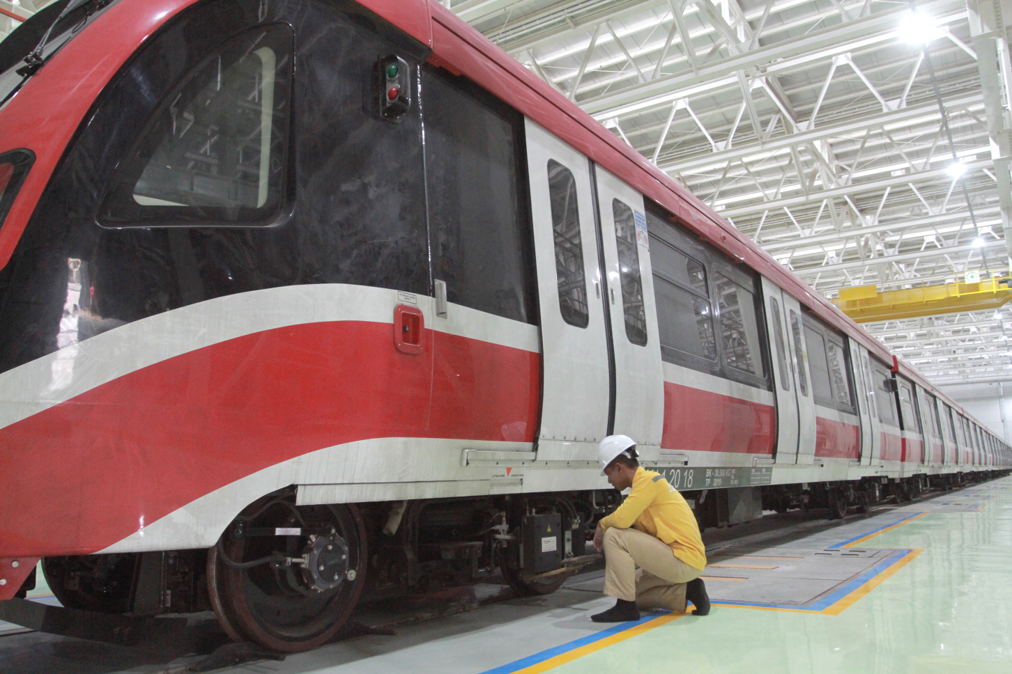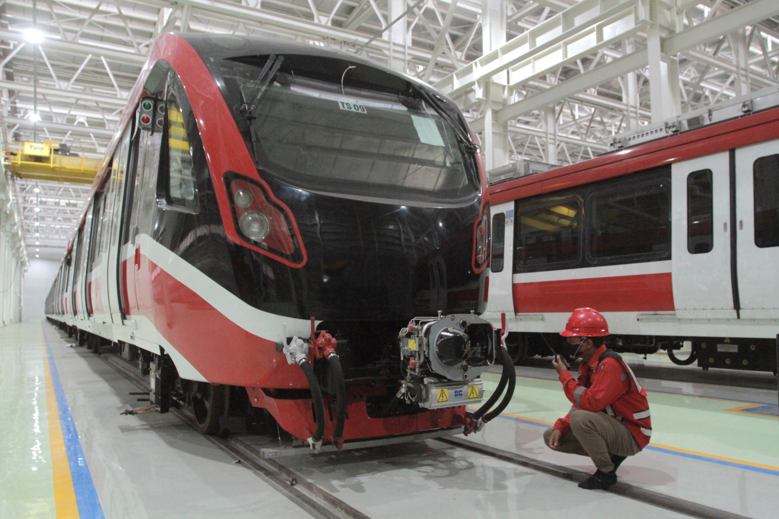 SinPo.id - Pekerja memeriksa rangkaian Lintas Rel Terpadu (LRT) yang terparkir pada Depo LRT Jabodebek di Jatimulya, Kabupaten Bekasi, Jawa Barat, Sabtu (4 Januari 2023). Pengerjaan proyek LRT Jabodebek secara keseluruhan telah mencapai 85 persen. LRT Jabodebek nantinya akan dioperasikan menggunakan sistem Communication-Based Train Control (CBTC) dengan Grade of Automation (GoA) level 3. Sistem CBTC adalah sistem pengoperasian kereta berbasis komunikasi, sehingga sistem dapat mengoperasikan kereta dan memproyeksikan jadwal secara otomatis dari pusat kendali operasi serta tanpa masinis. Nantinya dalam melayani masyarakat, LRT Jabodebek akan mengoperasikan 31 trainset/rangkaian, Adapun setiap trainset/rangkaian LRT Jabodebek terdiri atas 6 kereta. Dan ditargetkan beroperasi pada awal Juli 2023 mendatang.