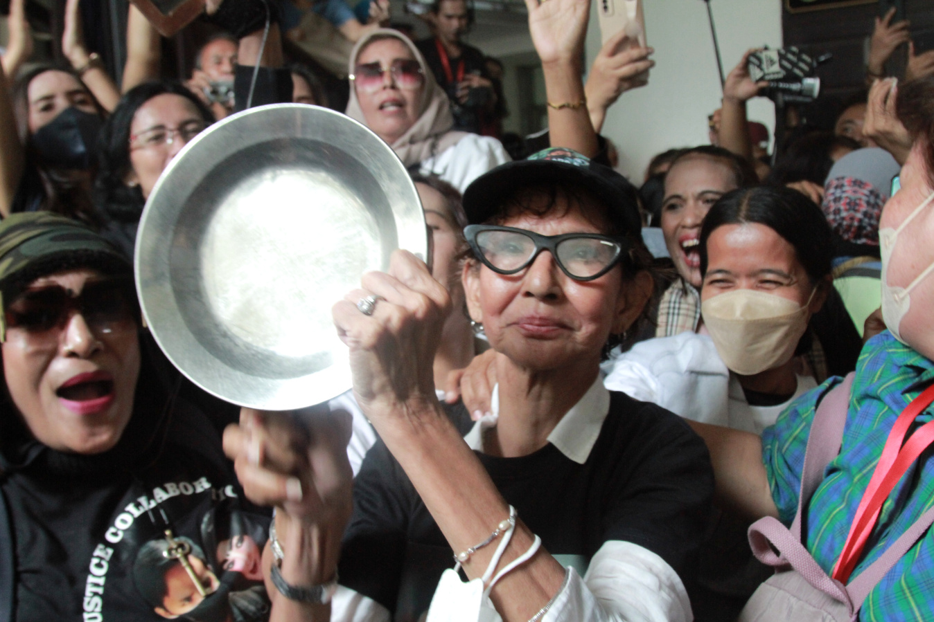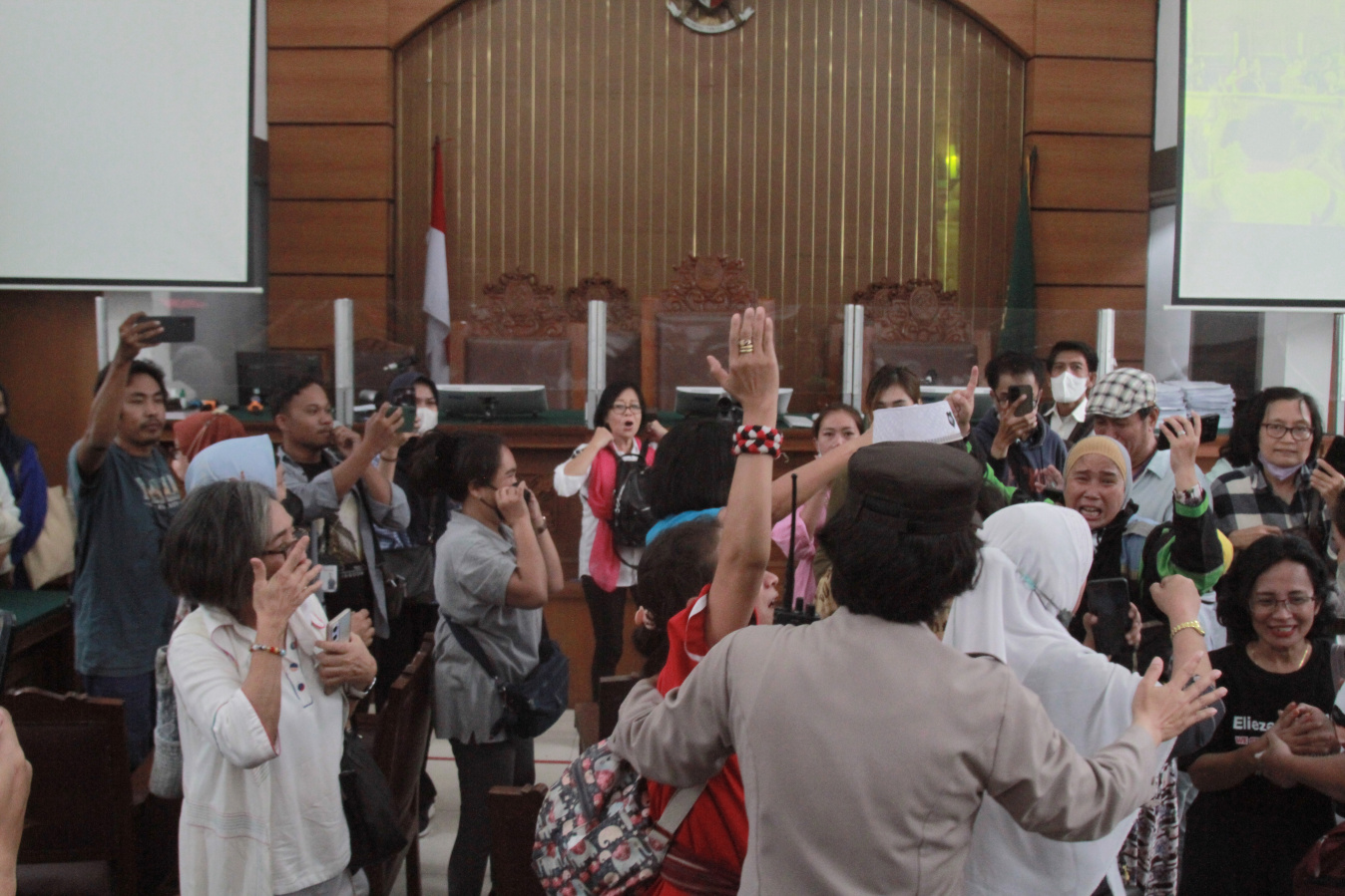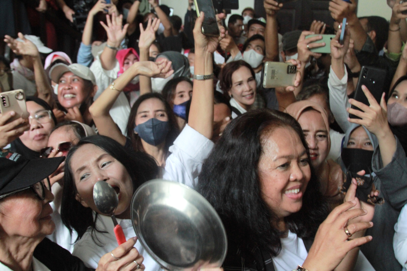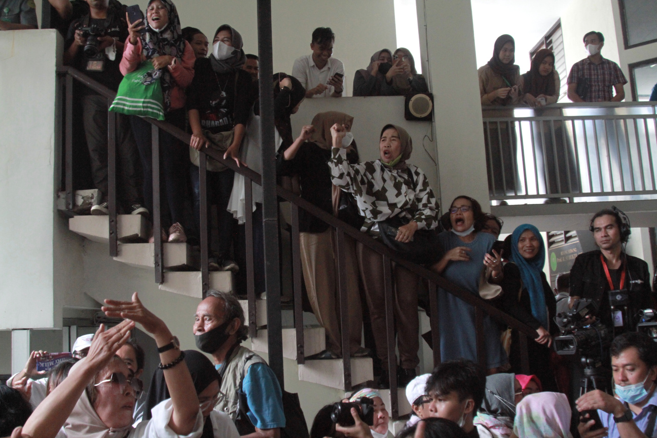 Fans Bharada E rayakan vonis ringan yang diberikan oleh Pengadilan Negeri Jakarta Selatan (Ashar/SinPo.id)