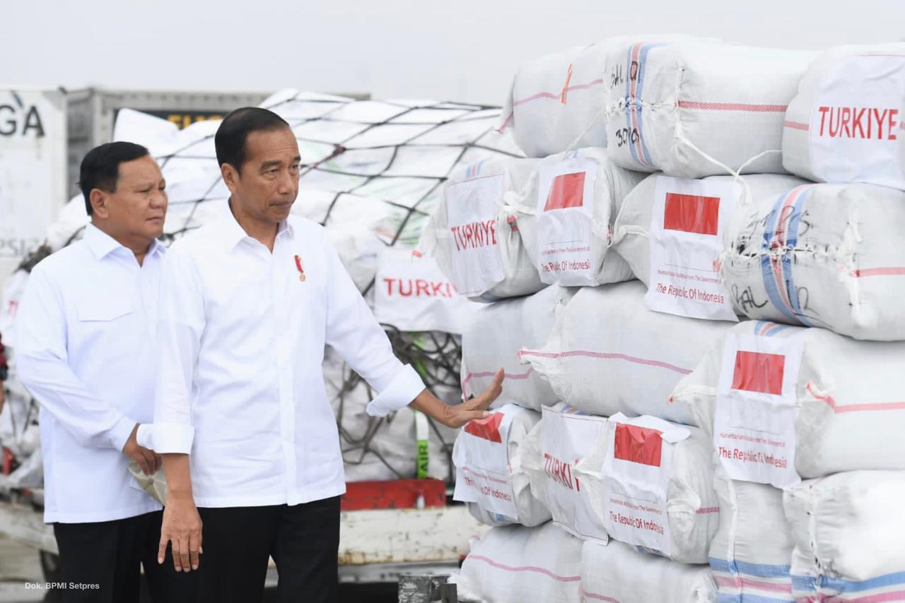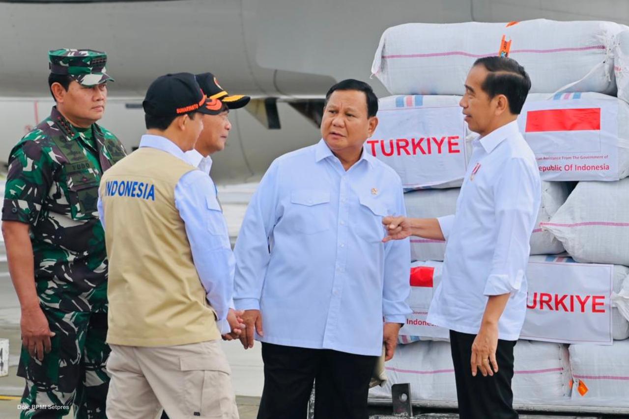 SinPo.id - Menteri Pertahanan (Menhan) Prabowo Subianto mendampingi Presiden Joko Widodo (Jokowi) memberangkatkan bantuan kemanusiaan untuk korban gempa Turki dan Suriah, dari Lanuh Halim Perdanakusuma, Jakarta, Selasa (21 Februari 2023). Ini merupakan bantuan tahap ketiga berupa logistik. Presiden Jokowi mengatakan bantuan kemanusiaan akan terus dikirimkan oleh Indonesia, Hari ini Indonesia kembali mengantarkan bantuan ke Turki dan Suriah demgan total berat 140 ton berupa bahan makanan, pakaian dan logistik. Sebelumnya kita juga sudah mengirim Tim SAR, Tim Medis dan rumah sakit lapangan. Turut hadir juga mendampingi Presiden Jokowi yakni, Menlu Retno Marsudi, Menko PMK Muhajir Effendy, Panglima TNI Laksamana Yudo Margono, Kapolri Jenderal Pol Listyo Sigit Prabowo, dan Kepala BNPB Letjen TNI Suharyanto serta Kabasarnas Marsdya TNI Heri Alfiandi.