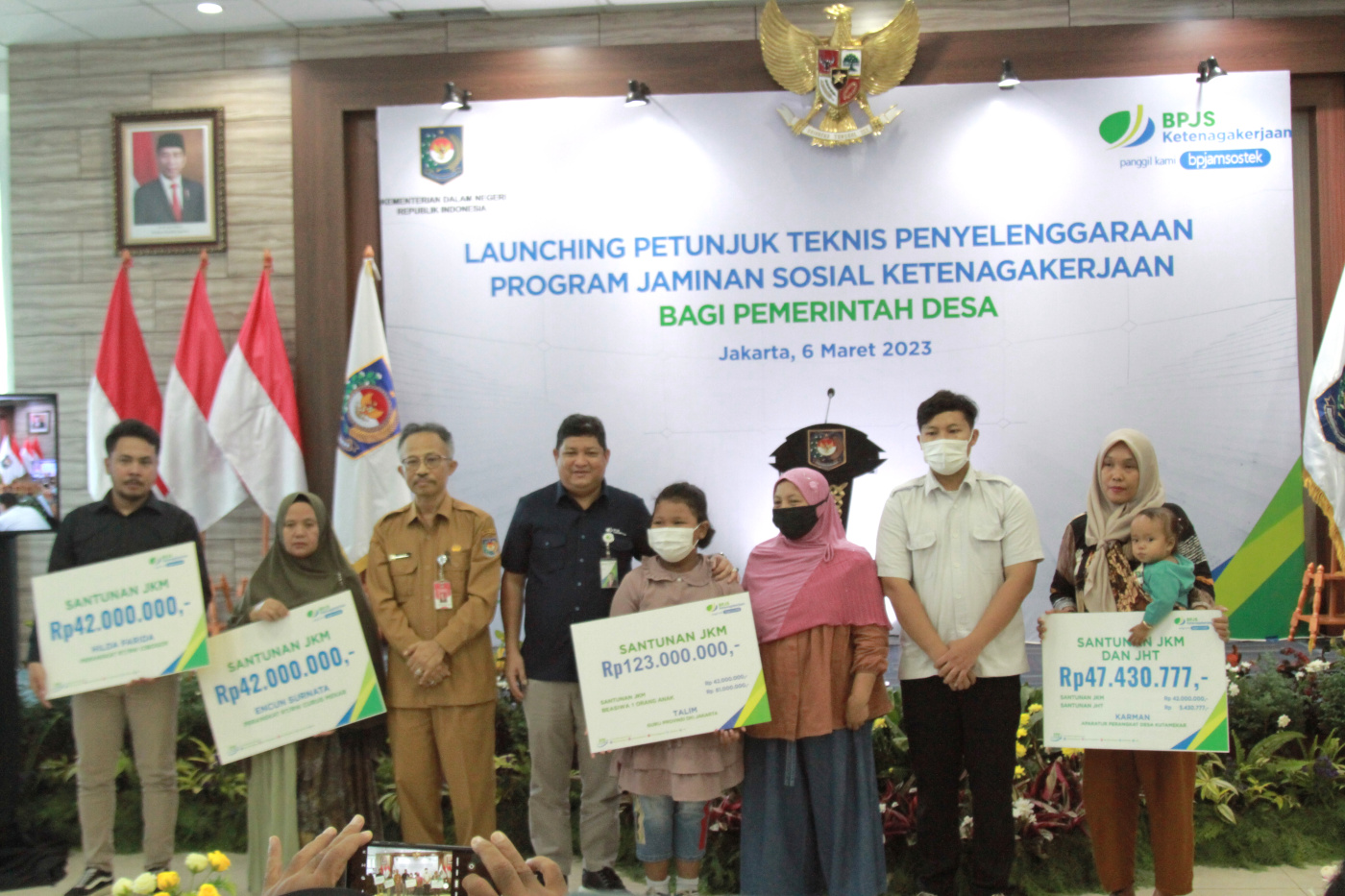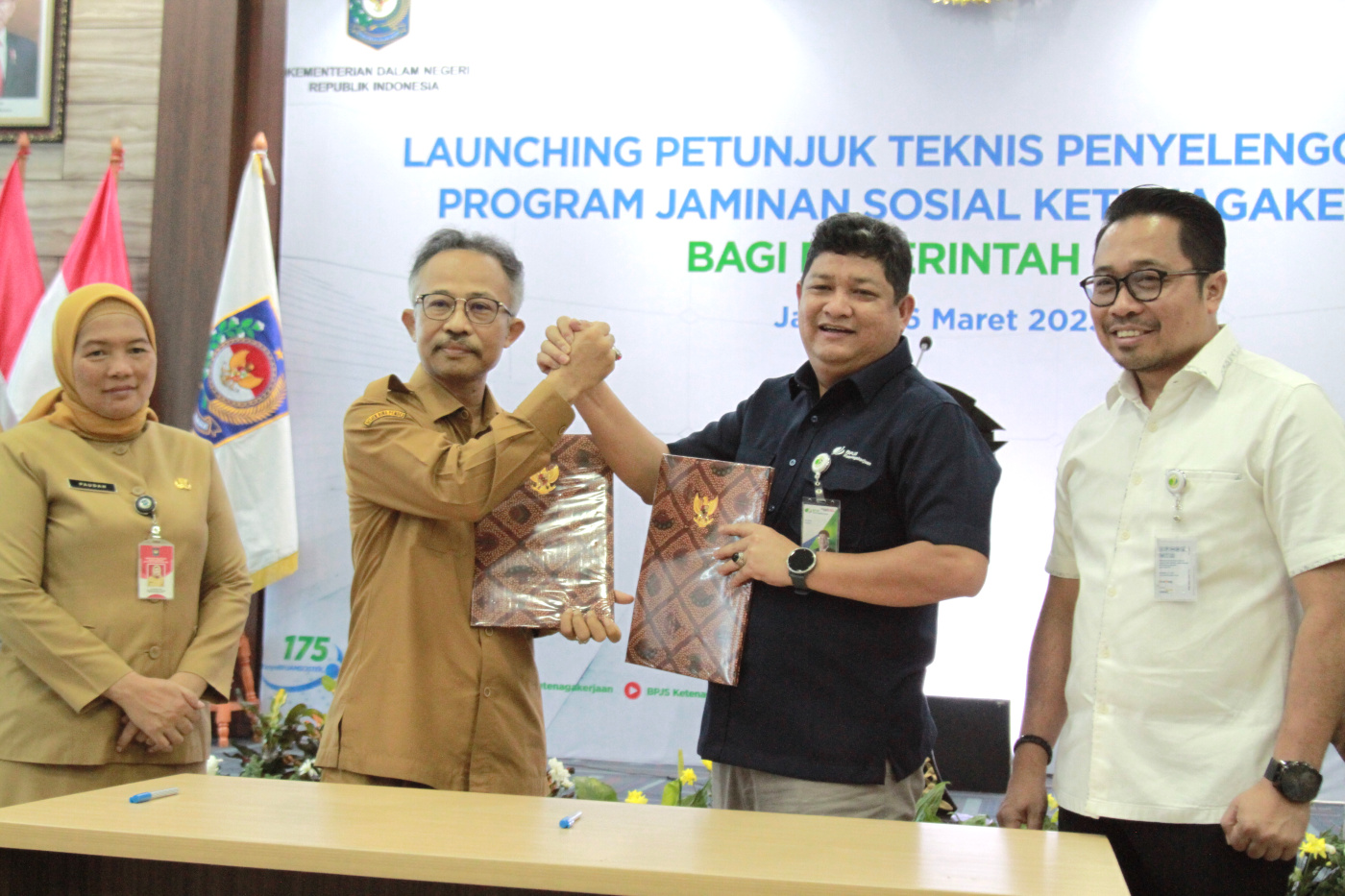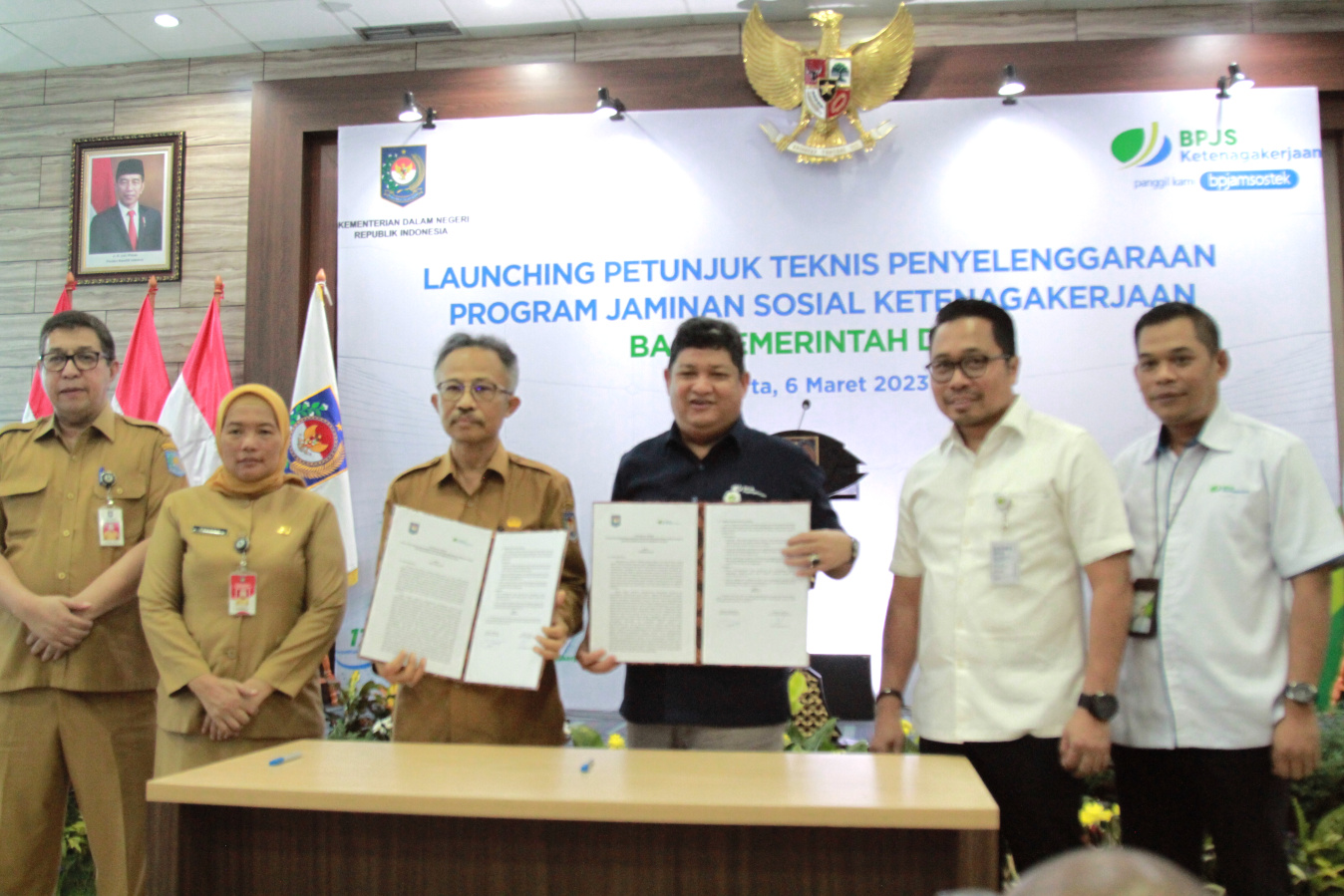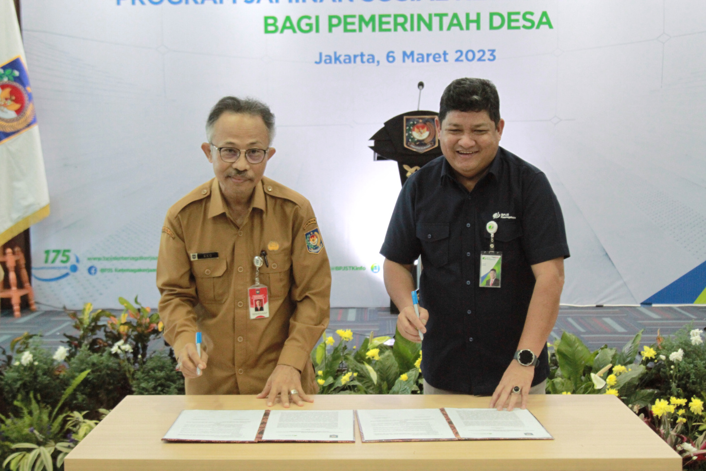 SinPo.id - Dirjen Bina Pemerintah Desa Kemendagri, Eko bersama Direktur Kepesertaan BPJAMSOSTEK Zainudin usai penandatanganan acara launching petunjuk teknis penyelenggaraan program jaminan sosial ketenagakerjaan bagi pemerintah desa di Jakarta, Senin (6 Maret 2023). Dalam rangka meningkatkan jumlah kepesertaan pekerja Indonesia terutama pekerja dalam Pemerintah Desa, BPJS Ketenagakerjaan bersama Kementerian Dalam Negeri (Ditjen Bina Pemerintah Desa) melaunching petunjuk teknis penyelenggaraan program jaminan sosial ketenagakerjaan bagi pemerintah desa.