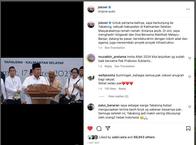 Unggahan Presiden Jokowi ditanggapi oleh warga Tabalong. Dia berbangga lantaran daerahnya dikunjungi tokoh-tokoh hebat seperti Presiden Jokowi dan Menhan Prabowo Subianto.