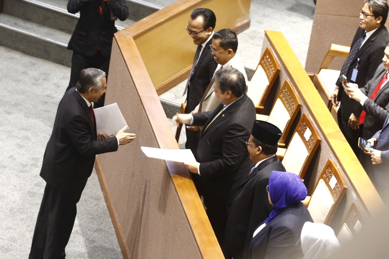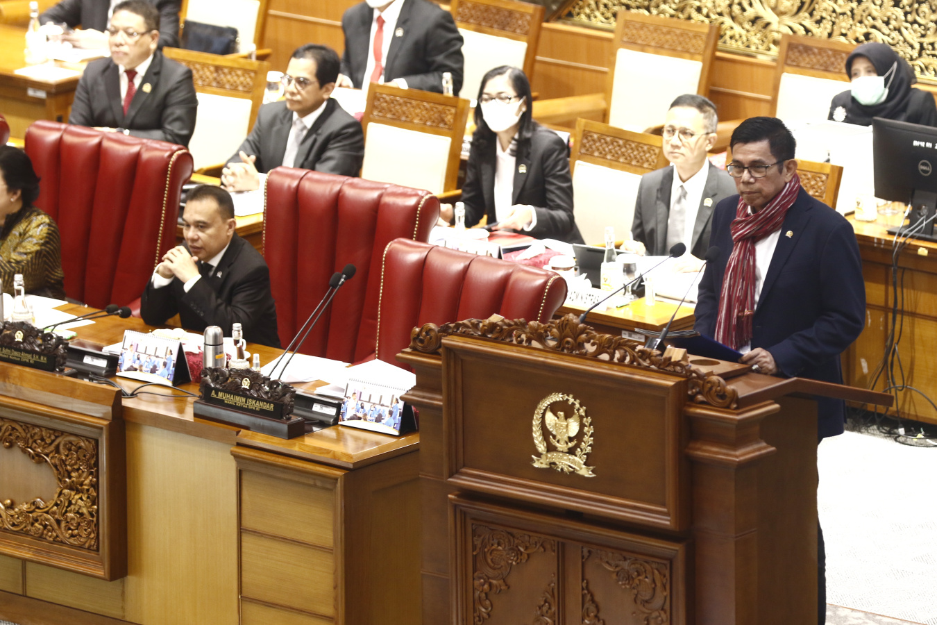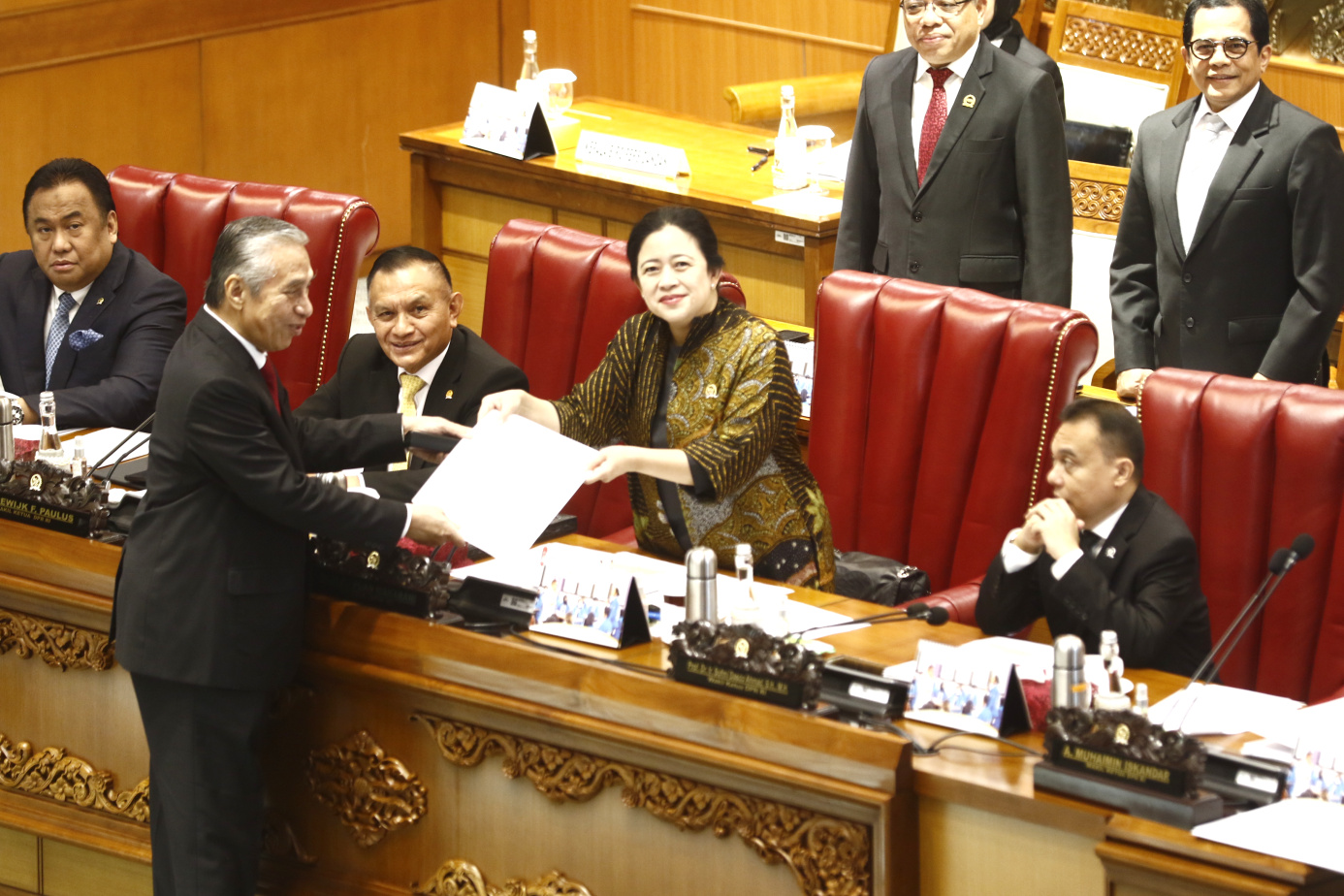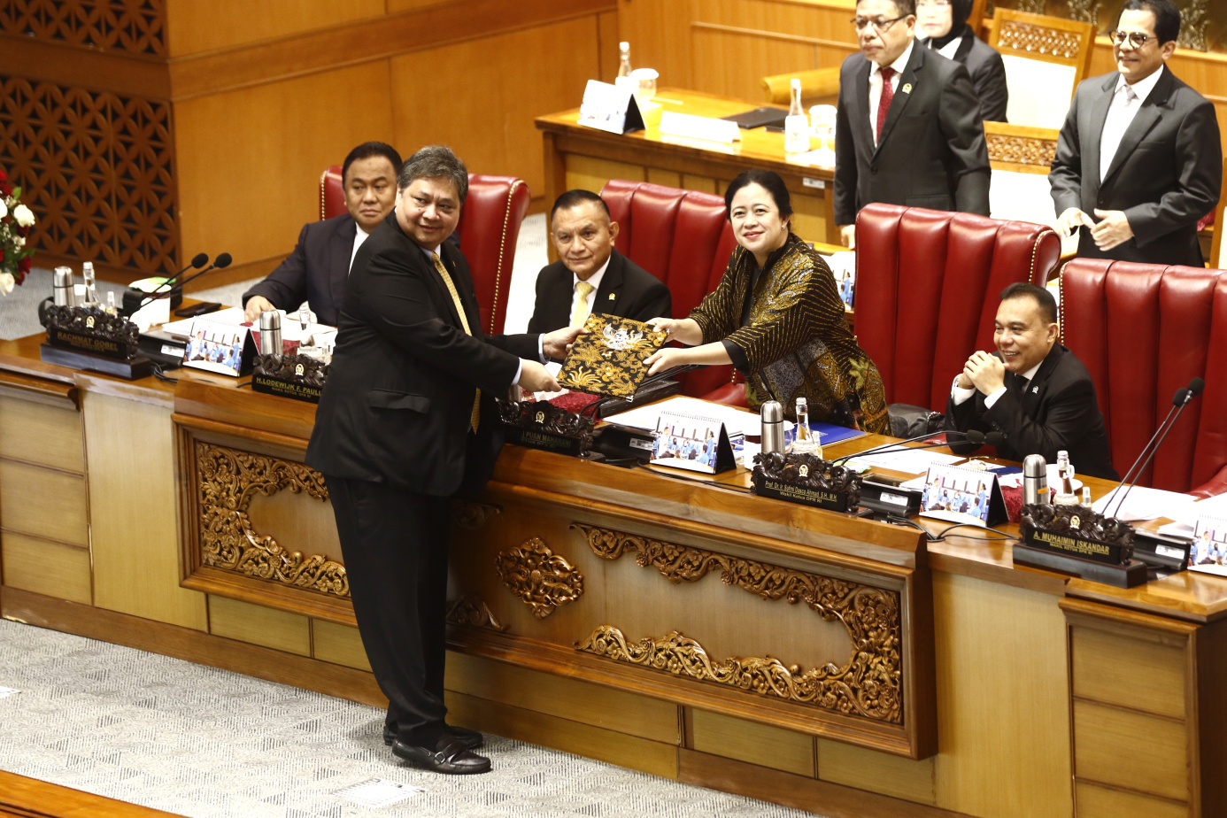 SinPo.id - DPR RI menggelar Rapat Paripurna Ke-19 Masa Persidangan IV Tahun 2022-2023 di Nusantara II, Kompleks Parlemen, Senayan, Jakarta, Selasa (21 Maret 2023). Dalam rapat paripurna tersebut dipimpin langsung oleh Ketua DPR RI Puan Maharani didampingi, Wakil Ketua DPR RI Prof Sufmi Dasco Ahmad, Wakil Ketua DPR RI Lodewijk F Paulus, Wakil Ketua DPR RI Rahmat Gobel. Menteri Koordinator Perekonomian Airlangga Hartarto sedang menyampaikan pandangan pemerintah atas pengesahan Perppu Cipta Kerja kepada Ketua DPR RI Puan Maharani. Dalam agenda paripurna tersebut DPR mengesahkan Peraturan Pemerintah Pengganti Undang-Undang Nomer 2 Tahun 2022 tentang Cipta Kerja (Perppu Ciptaker) menjadi Undang-Undang (UU).