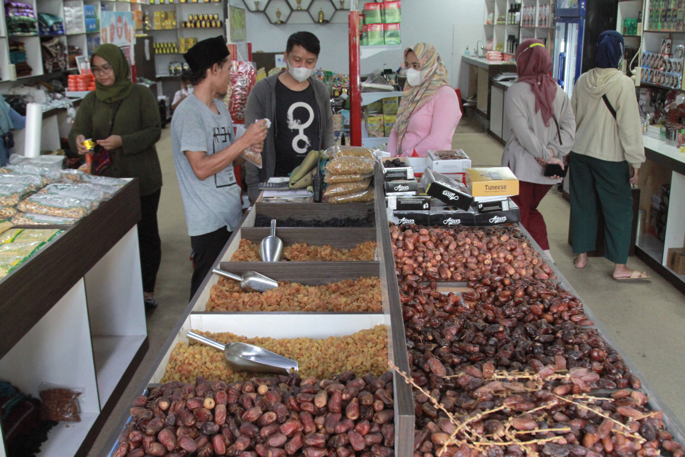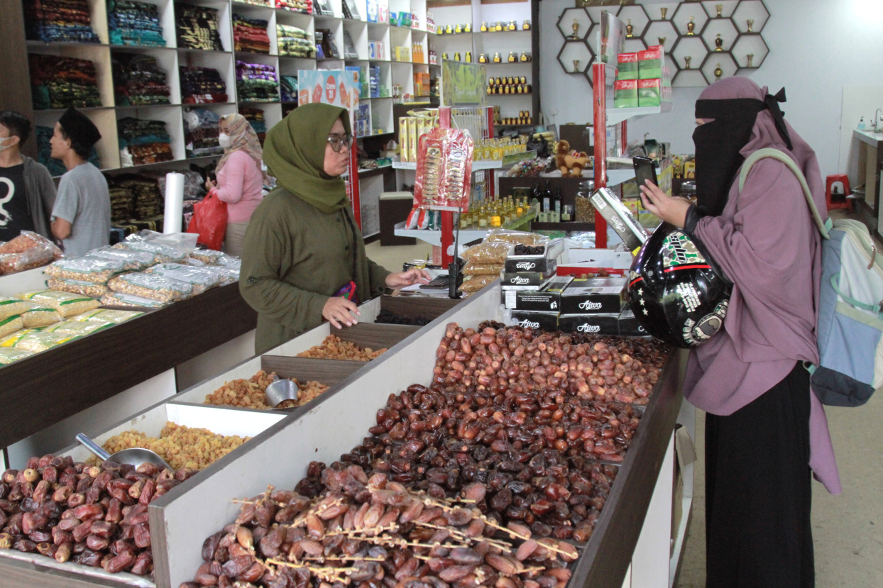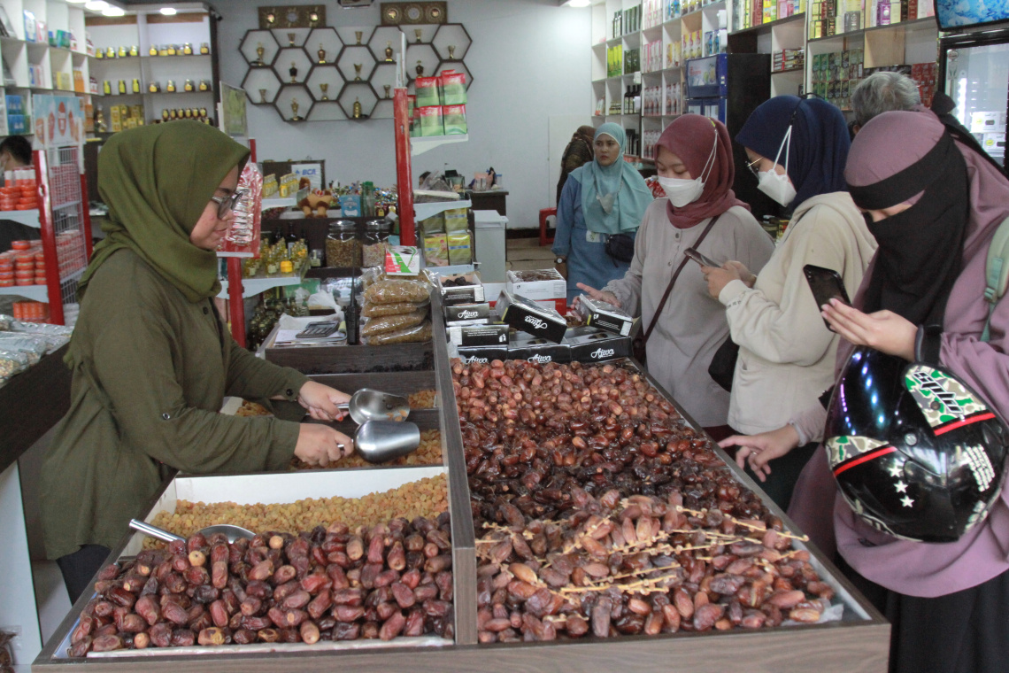 SinPo.id - Pedagang Kurma dipadati para pembeli yang sedang mencari makanan ringan untuk menu pembuka untuk berbuka puasa di Pasar Tanah Abang, Jakarta, Kamis (23 Maret 2023). Pedagang kurma tokoh oleh-oleh haji 786 selain jual kurma juga menjual aneka permen dan kacang untuk menu takjil. Untuk harga Kurma Tunisia Tangkai 1 Kilogram dihargai Rp. 90.000, Kurma Mesir golden dihargai 1 Kilogram seharga Rp. 50.000, Kurma Calas 1 Kilogram seharga Rp. 50.000, Kurma Tunisia Madu 1 Kilogram seharga Rp. 80.000 dan Kurma Arab 1 Kilogram seharga Rp. 50.000. Makanan ringan buah kurma ini sangat cocok untuk menu pembuka saat berbuka puasa dan sangat menyehatkan untuk tubuh kita yang seharian menjalani puasa.