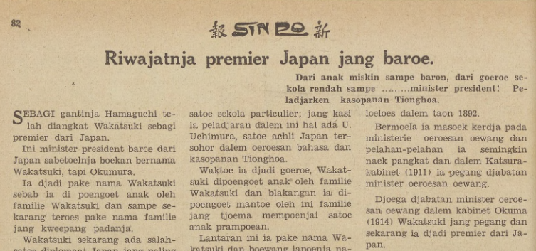 Dari goeroe sampe premier. Wakatsuki, premier baroe dari Japan. Bermoela ia masoek kerdja pada ministerie oeroesan. oew,ang' dian pelahan-pelahan ia semingkin naek pangkat dan dalem tsura[1]kabinet (1911) ia pegang djabatan minister oeroesan. oewang. Djoega djabat.a.n minister oeroe[1]san oewang dalem kabinet Okuma (1914) Wakatsuki jang pegang dan sekarang ia djadi premier dari Ja[1]pan.