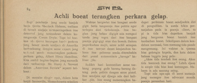 Kita ambil bagian-bagian jang menarik dari 'oelisannjc Mr. Harry A. Stewart dalem , American Review'* seperti bri[1]koet : Di moesim dir,g卜 1921,dalem kota ketjil Saxonville, Massachusetts sekalian pendoedoek soeda dibikin koeatir oleh pentjoerian-pentjoerian jang terdjadi dengen beroentoen. Roepanja itoe se[1]moea pentjoerian soeda dilakoeken oleh satoe orang jang boleh djadi kenal baek keadahan dalem itoe kampoeng. Antara barang jang ditjoeri ada teritoeng satoe pistol automatisch merk „Savage” ka[1]liber .380 Satoe pembesar politie soeda diserahin pakerdjahan boeat kedjer sam[1]pe dapet itoe bangsat jang sanget koe[1]tang adjar.