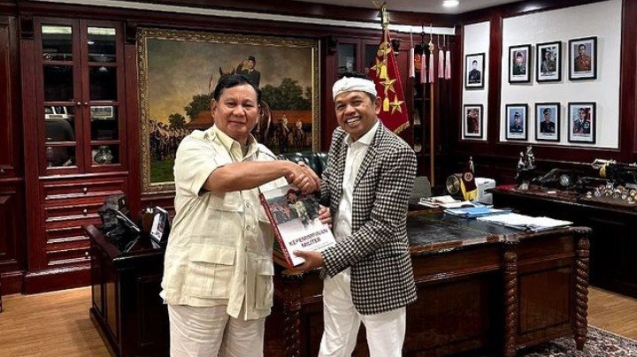 Dalam foto itu, Dedi nampak bersalaman dengan Prabowo di sebuah ruangan. Sambil bersalaman, keduanya memegang buku Kepemimpinan Militer karya Prabowo Subianto.