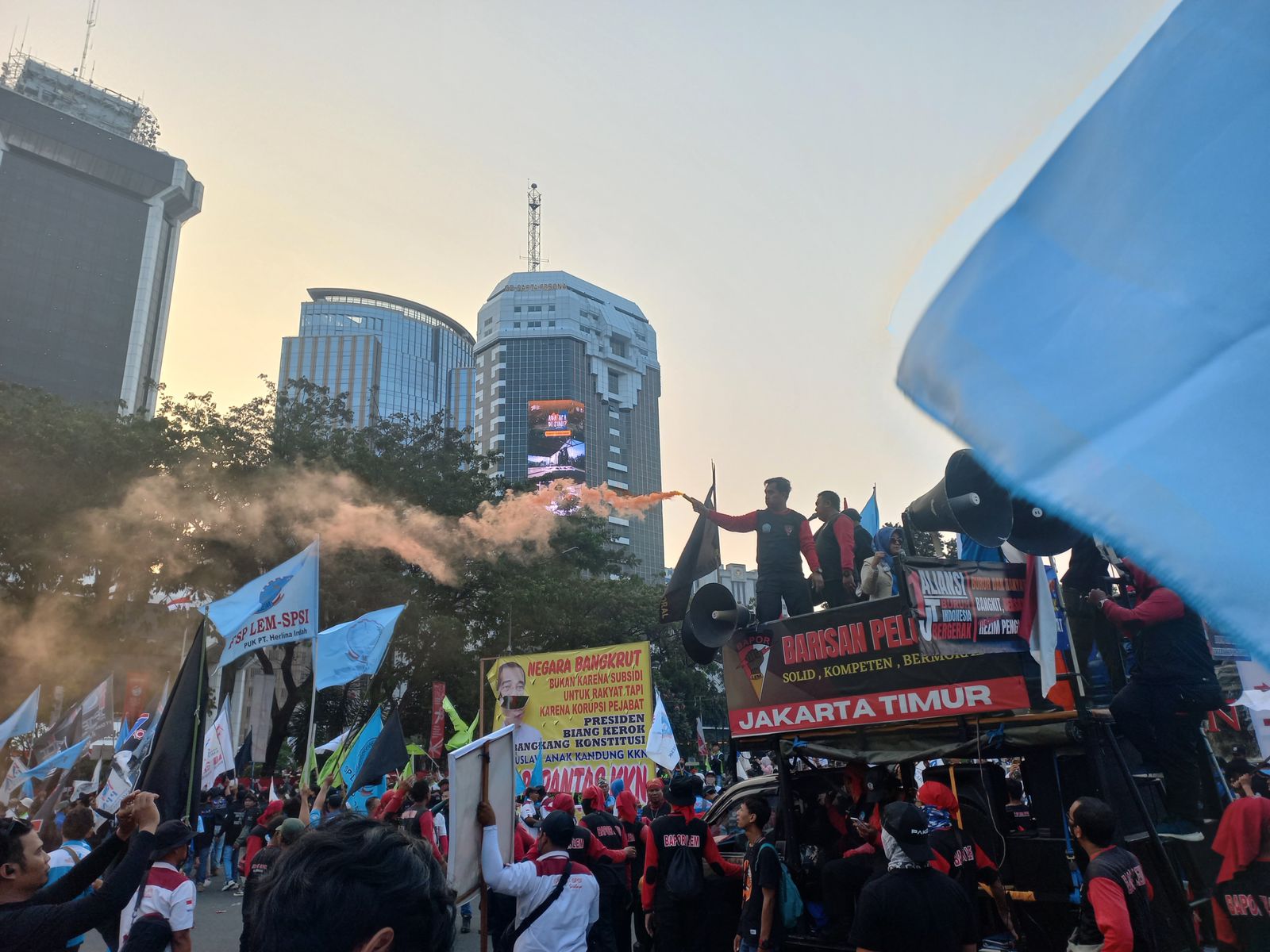 SinPo.id - Ratusan massa mengatasnamakan Aliansi Masyarakat Anti Mafia Tambang (AMANAT) Kabupaten Sumbawa Barat (Amanat KSB) menggeruduk kantor PT Meta Epsi Drilling Company (MEDCO) Energy di Jalan Ampera Raya, Jakarta Selatan, Selasa, 23 Mei 2023.