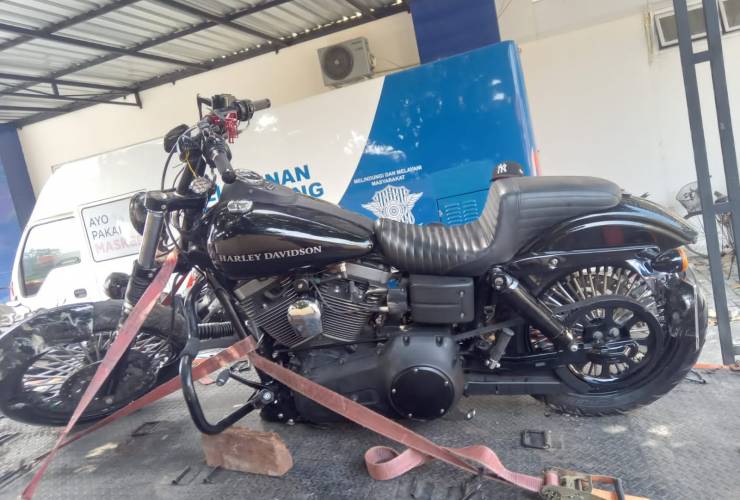 SinPo.id - Sepeda motor gede (moge) berjenis Harley Davidson ringsek usai menghantam sebuah truk di Jalan Srandakan, tepatnya di Bajang, Wijirejo, Pandak, Bantul, Yogyakarta. Akibat kecelakaan ini, pengendara moge mengalami luka berat pada bagian kepala.