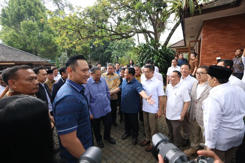 Ketua Majelis Tinggi Partai Demokrat Susilo Bambang Yudhoyono (SBY) bersama AHY dengan didampingi jajaran anggota Majelis Tinggi dan DPP Partai Demokrt bertemu Prabowo di Hambalang, Kabupaten Bogor, Jawa Barat, Minggu, 17 September 2023.