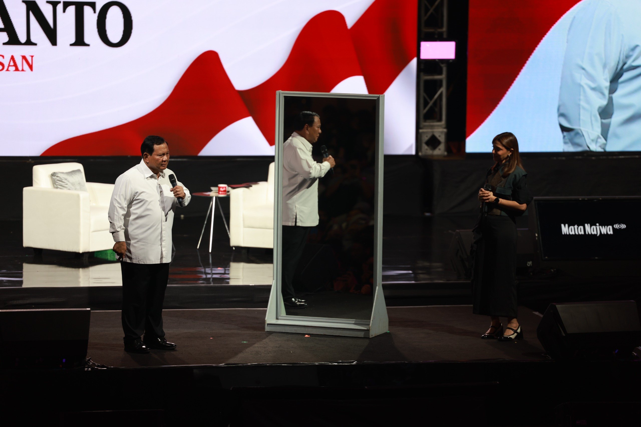SinPo.id - Bakal calon presiden (capres) Prabowo Subianto tidak memamerkan cuplikan fotonya saat menghadiri undangan sebagai pembicara dalam 'Mata Najwa on Stage: 3 Bacapres Bicara Gagasan' di Graha Sabha Pramana Universitas Gadjah Mada (UGM), Yogyakarta pada Selasa, 19 September 2023.