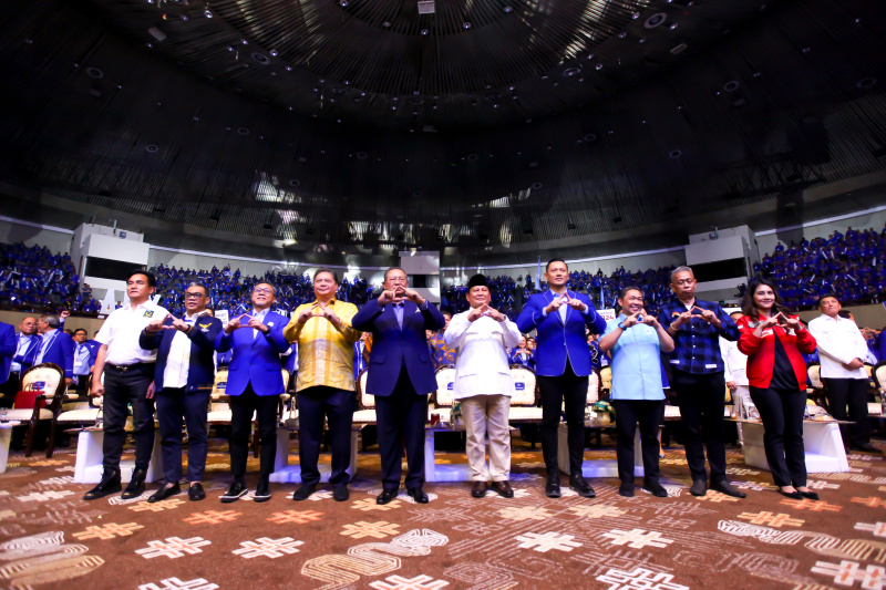 SinPo.id - Partai Demokrat menggelar Rapinmas yang dihadiri oleh Ketua Majelis Tinggi Demokrat Susilo Bambang Yudhoyono (SBY), Ketua Umum Demokrat Agus Harimurti Yudhoyono (AHY) beserta petinggi partai Demokrat dan juga hadir Para Petinggi Koalisi Indonesia Maju (KIM) Ketua KIM Prabowo Subianto, Ketua Umum Partai Golkar Airlangga Hartarto, Ketua Umum PAN Zulkifli Hasan, Ketua Umum PBB Prof Yusril Ihza Mahendra, Ketua Umum Partai Gelora Anis Matta, Ketua Umum Partai Garuda Ahmad Ridha, Plt Sekjen PSI Isyana Bagoes Oka di Jakarta Convention Center, Jakarta, Kamis (21 September 2023) malam. Dalam Rapinmas Partai Demokrat tersebut mengumumkan secara resmi bahwa Demokrat Deklarasi mendukung Ketua Umum Partai Gerindra Prabowo Subianto sebagai Presiden 2024.