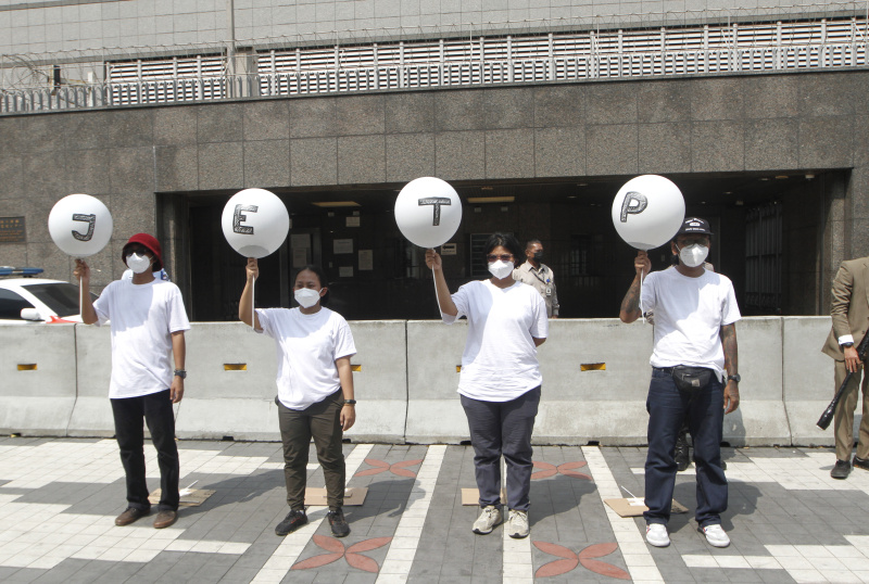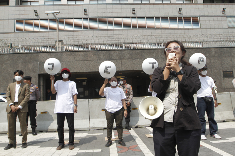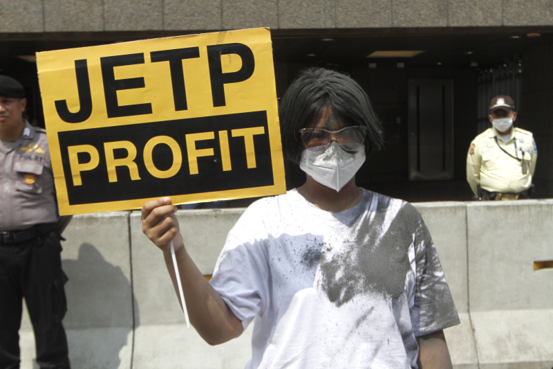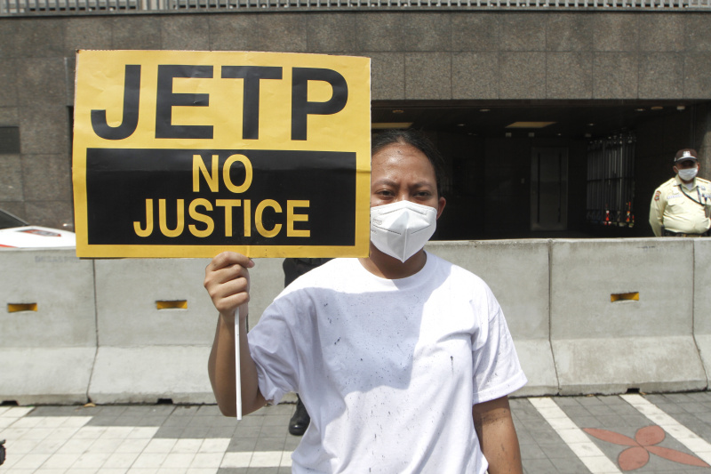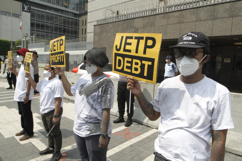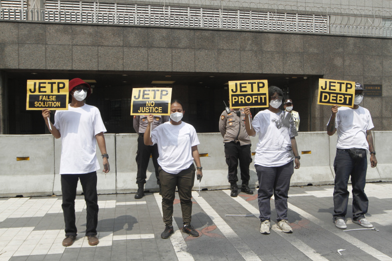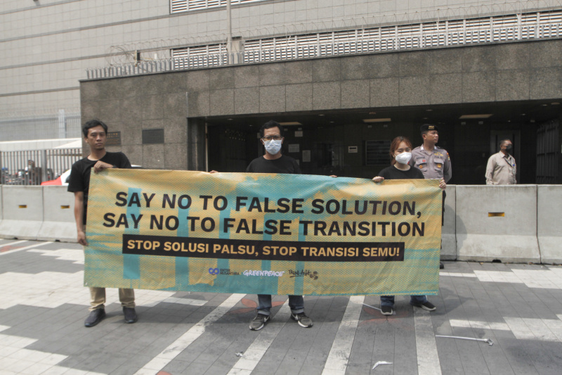 SinPo.id - Aktivis Greenpeace dan Trend Asia menggelar demo teaterikal tentang Rencana Investasi dan Kebijakan Komprehensif (CIPP) Just Energy Transition Patnership (JETP) di Kedustaan Besar Jepang, Sudirman, Jakarta, Senin (20 November 2023). Para Aktivis Greenpeace membawa spanduk berisikan pesan" Just Energy Transition For People, Not Profit (Transisi Energy yang Berkeadilan Untuk Rakyat, Bukan Profit) dan "Say No To False Solution, Say No To False Transition (Katakan Tidak Untuk Solusi Palsu, Katakan Tidak Untuk Transisi Palsu).